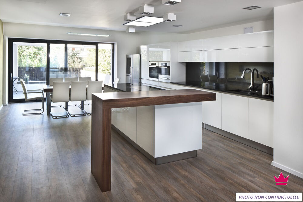 Matériaux haut de gamme : Carrelage en grès cérame 60x60, parquet stratifié dans les chambres, et menuiseries en PVC avec double vitrage isolant.