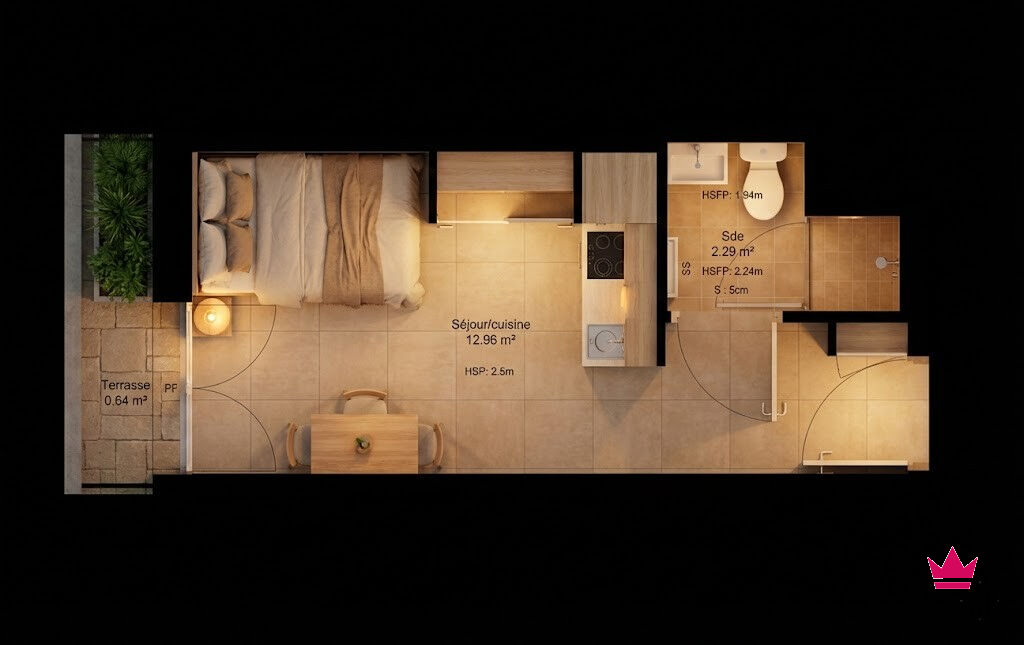 Le logement développe une surface habitable de 17,69m², parfaitement optimisée, comprenant une pièce de vie avec kitchenette de 15,05 m² et une salle d'eau fonctionnelle de 2,64m². L'agencement a été pensé pour offrir un usage fluide et efficace, sans perte d'espace, avec une hauteur sous plafond d'environ 2,50 m, garantissant confort et luminosité. Le studio dispose également d'une terrasse privative, un véritable atout pour ce type de typologie, particulièrement recherché par les locataires étudiants.