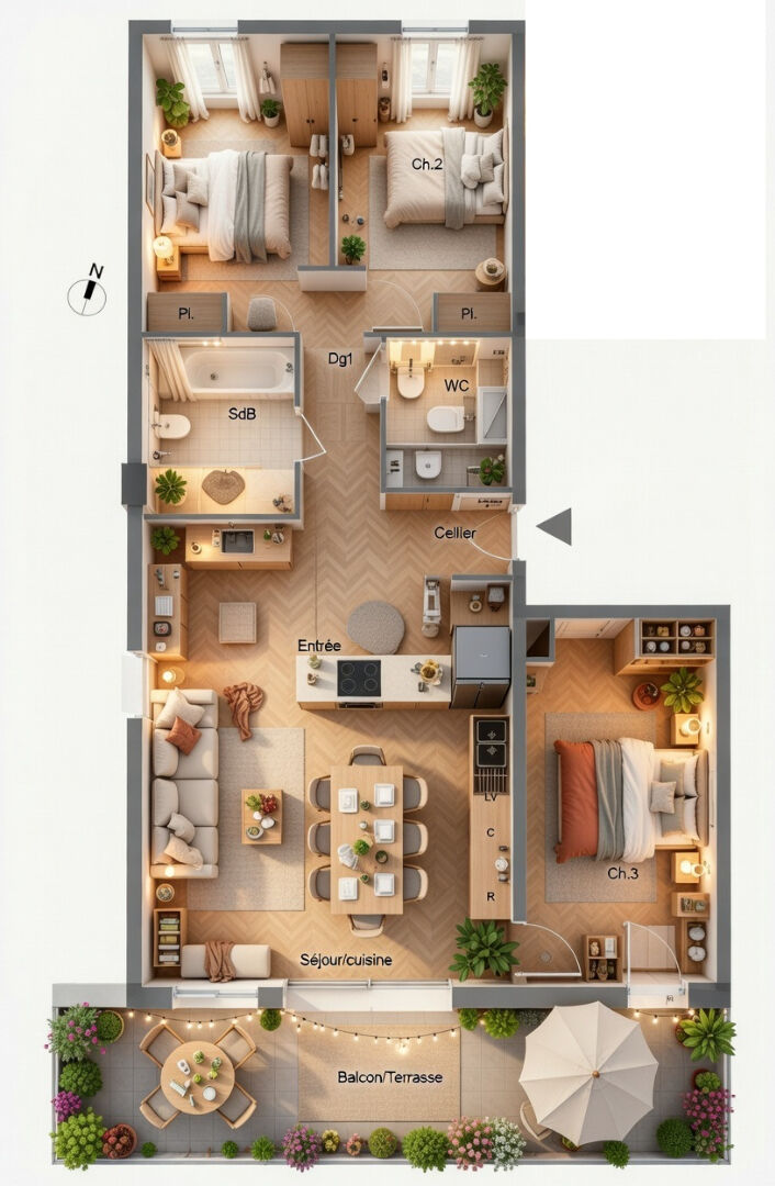 Revêtements de qualité : carrelage 60x60 cm dans les pièces de vie, parquet contrecollé dans les chambres, et volets roulants motorisés pour un confort optimal.