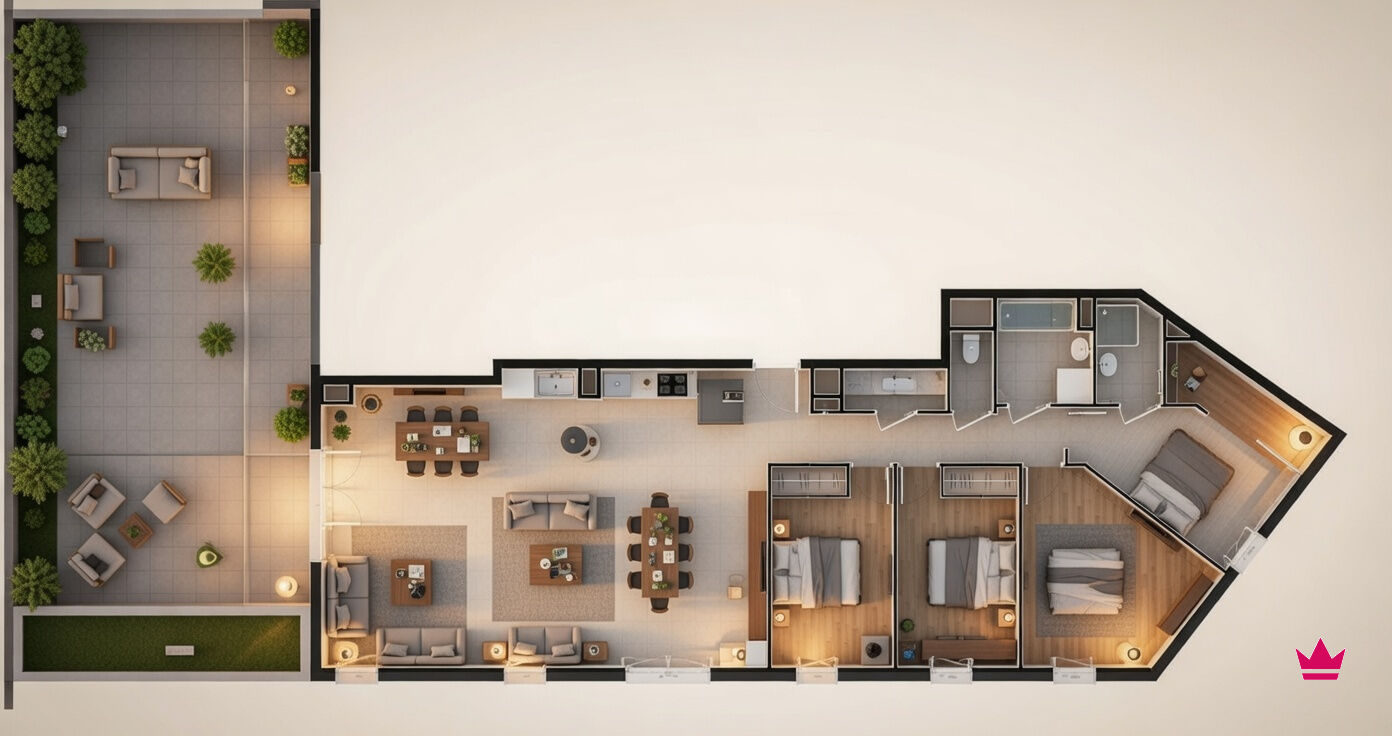 Grand séjour de 60,28 m² avec cuisine ouverte, baigné de lumière naturelle grâce aux larges baies vitrées.