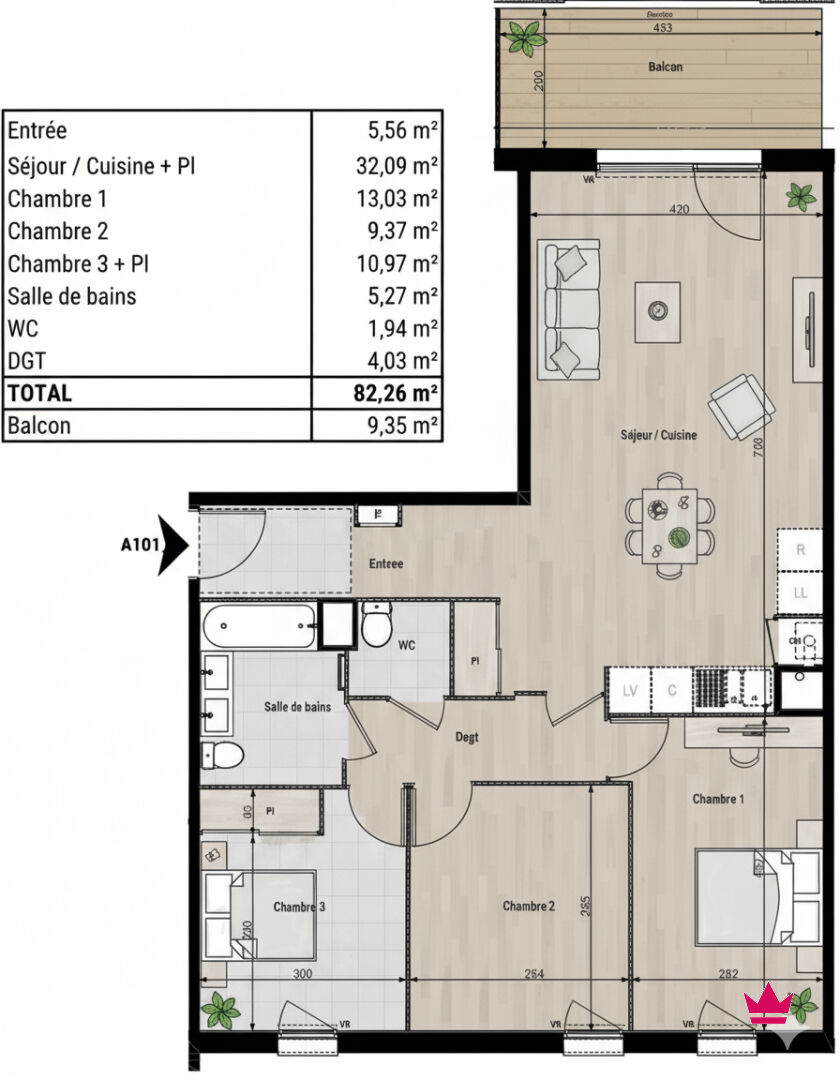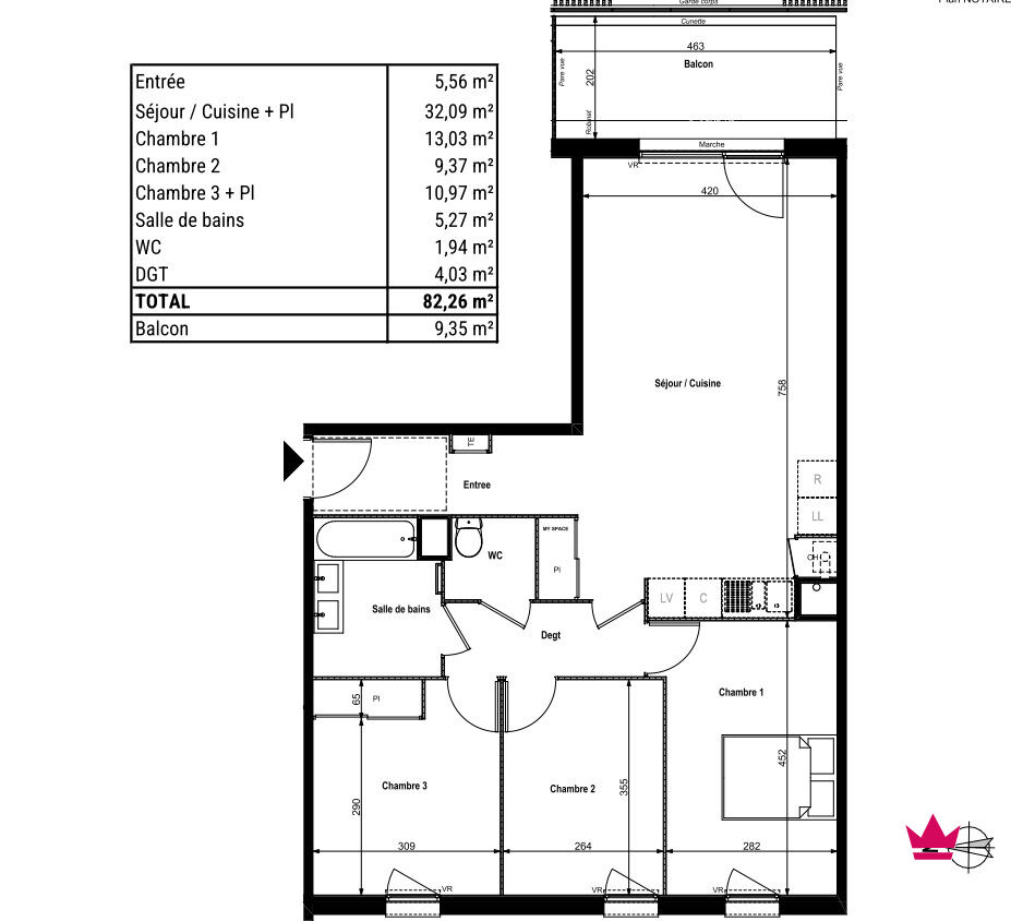 Séjour de plus de 32m² , vue dégagée au calme, 3 chambres, salle de bains équipée.