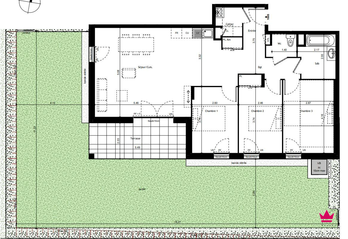 Séjour/cuisine de 36.22m², il comprend 3 chambres, un cellier/ buanderie ainsi qu'une salle de bain et des WC séparés.