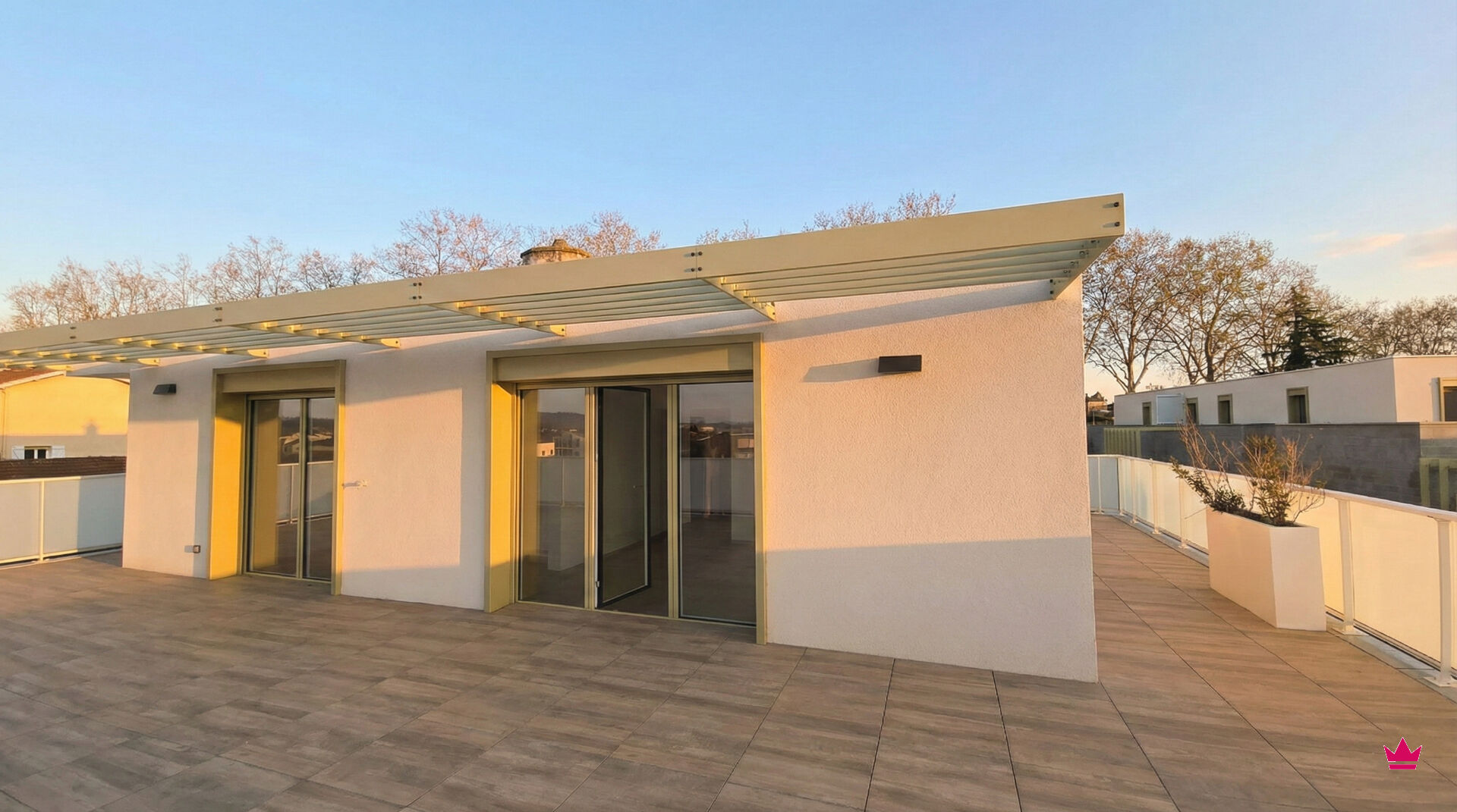 Pièce de vie de 45m² exposée sud-ouest donnant sur une terrasse de 108m², 3 chambres,.
