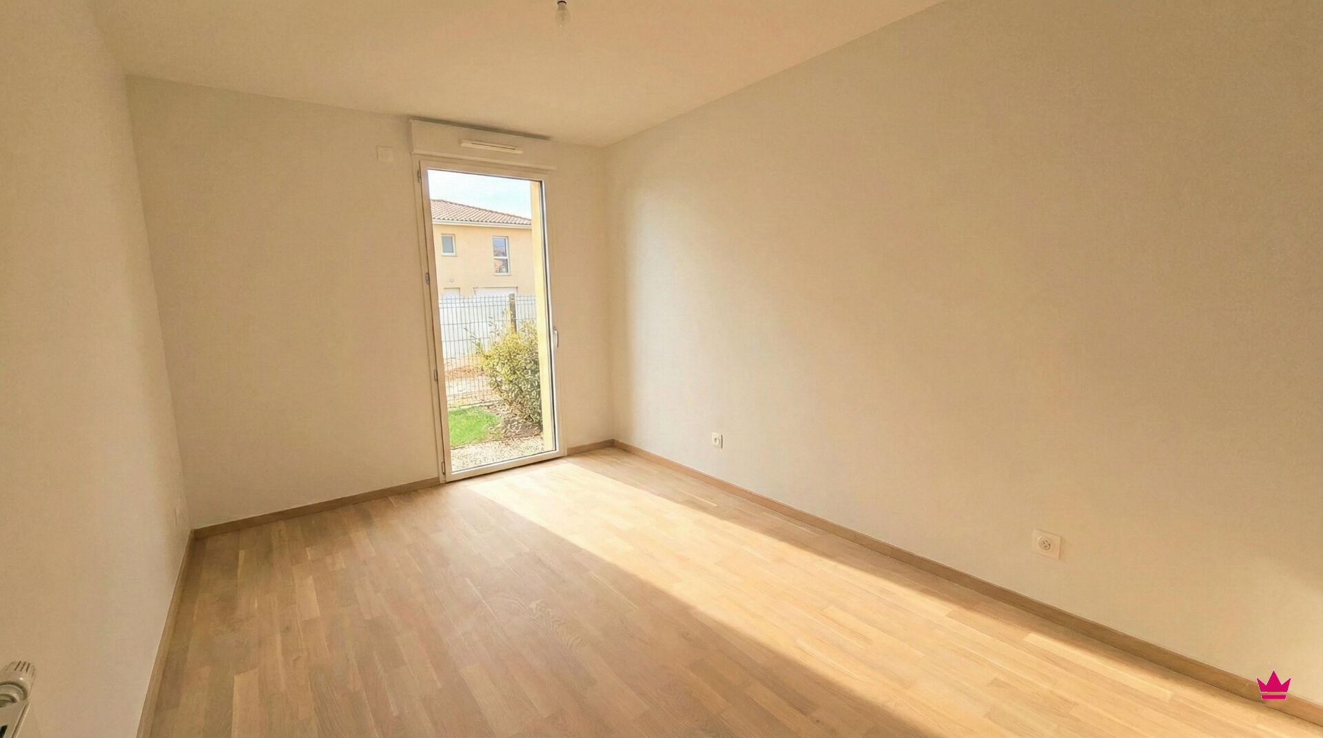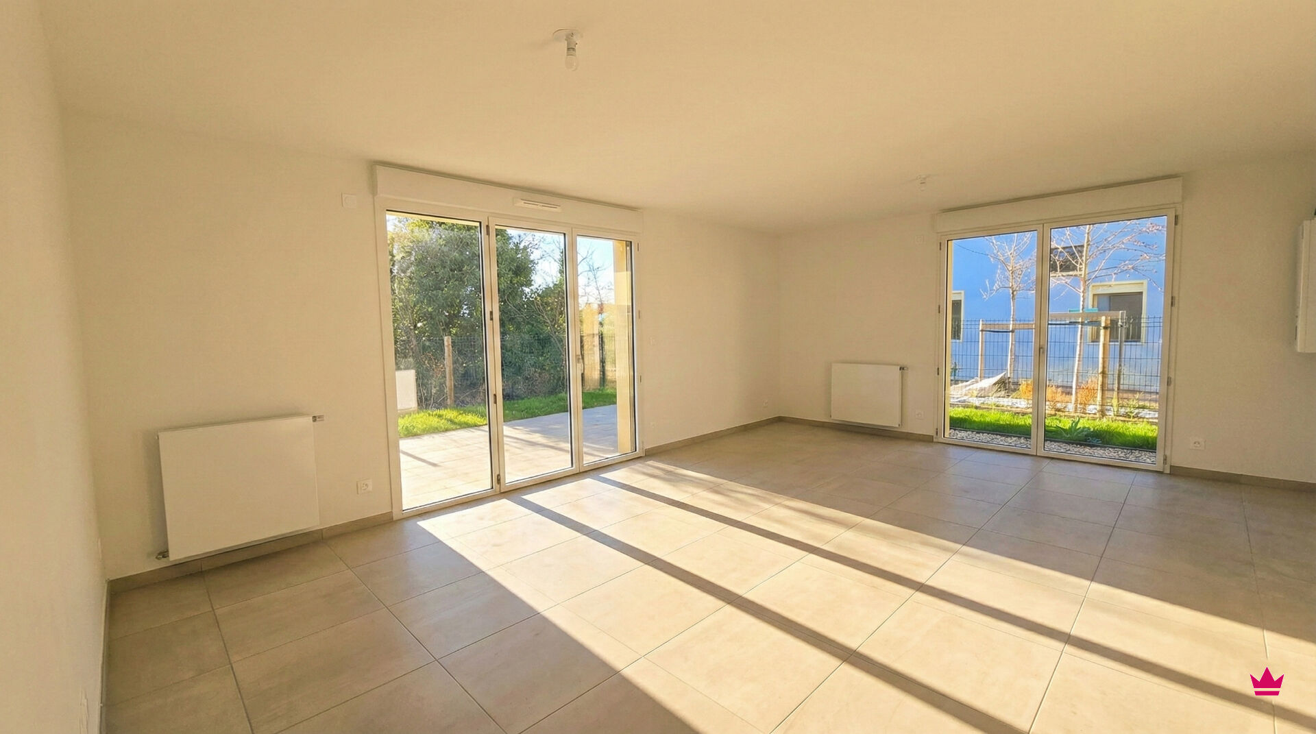 Pièce de vie de 31m² exposée ouest donnant sur un jardin de 60m² avec terrasse, 3 chambres, 2 salles de bains, wc.