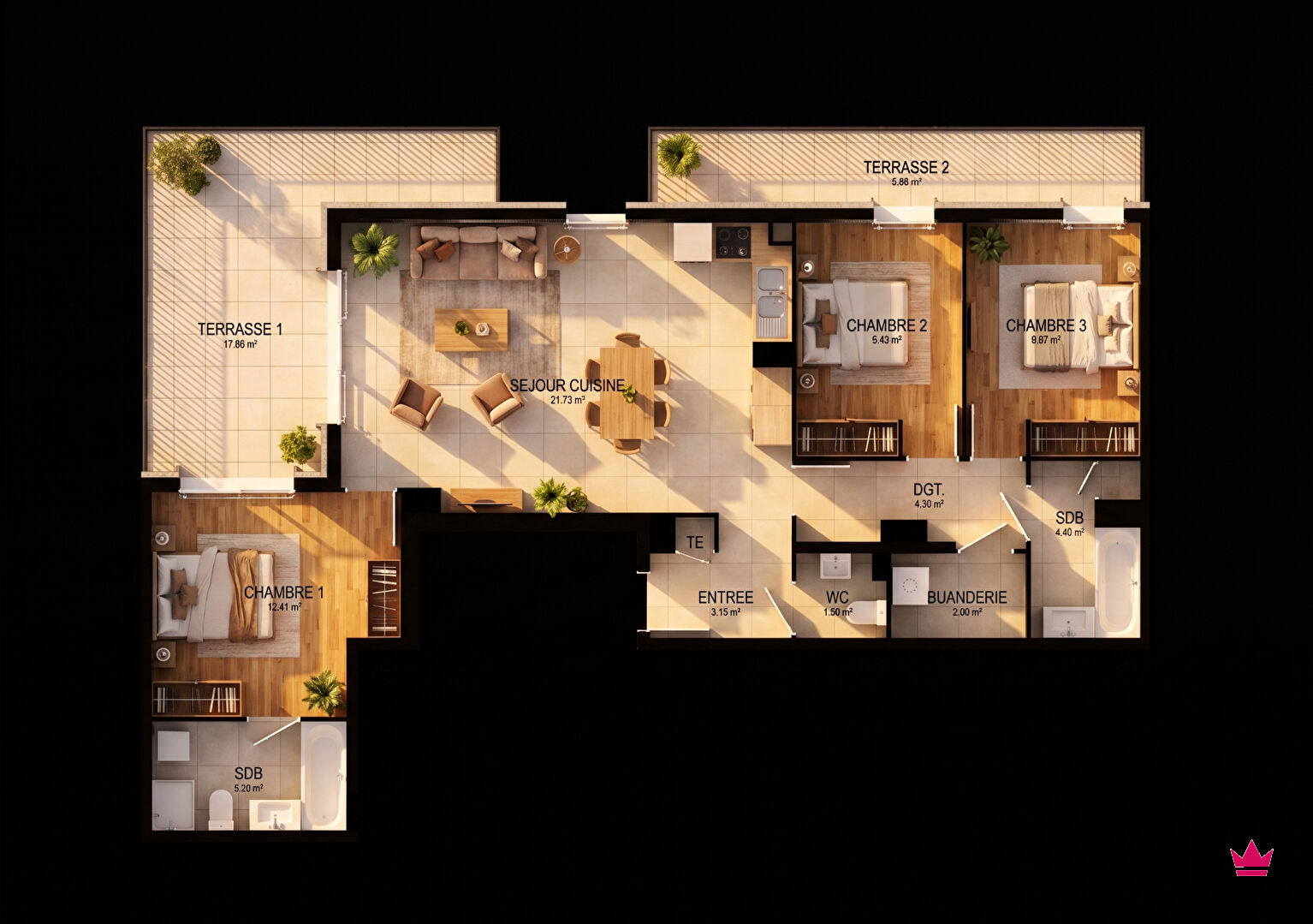 Pièce de vie de 31m² exposée ouest , 3 chambres, 2 salles de bains, wc et buanderie.