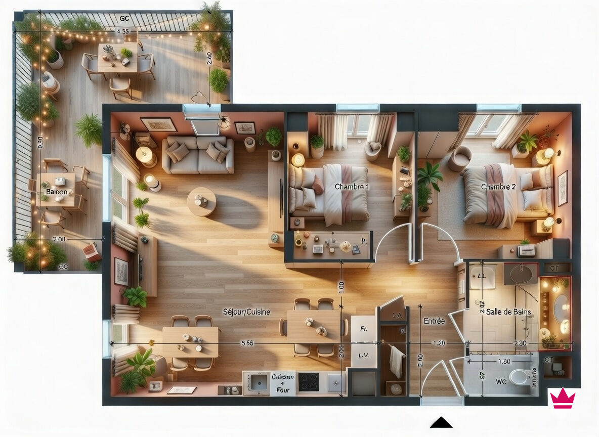 Balcon spacieux de 17,91 m² : Un espace extérieur pour se détendre, équipé d'un éclairage et d'une prise électrique.