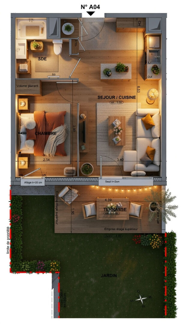 Terrasse de 8,60 m² et jardin de 33,61 m² pour des moments en plein air, en toute intimité.