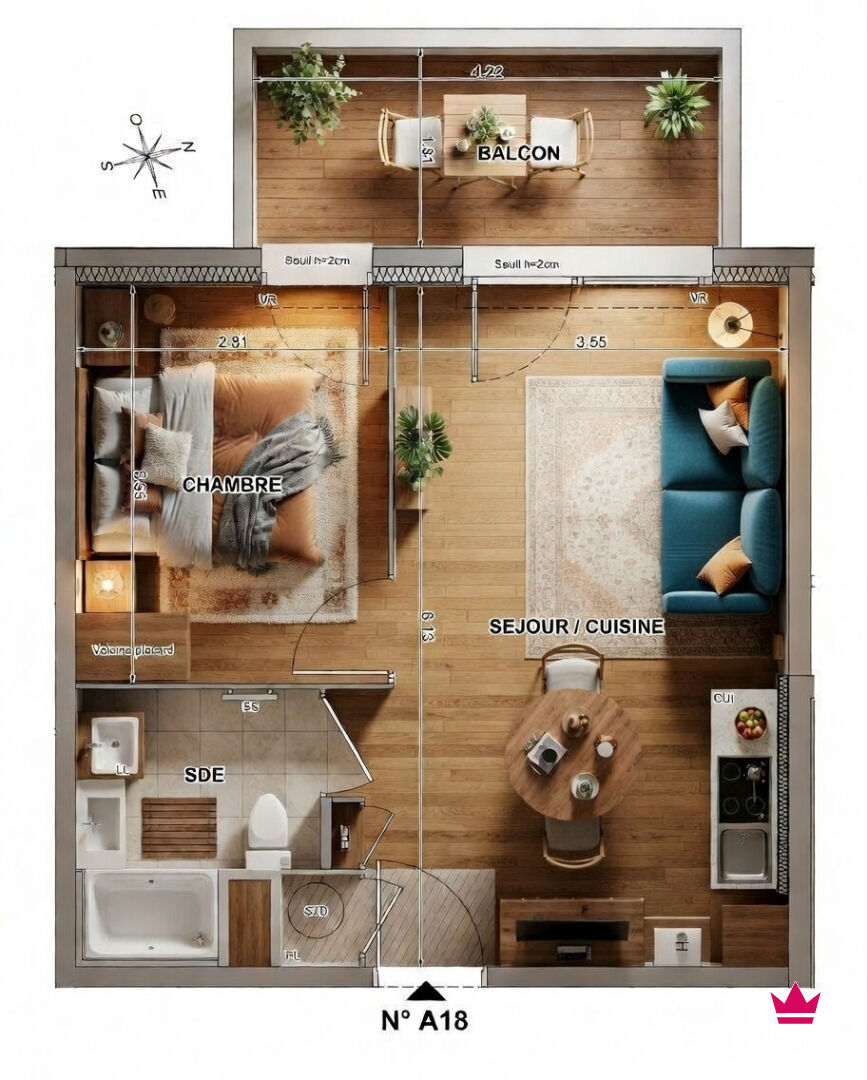Séjour/cuisine de 22,68 m², ouvert et lumineux, idéal pour partager des moments conviviaux.