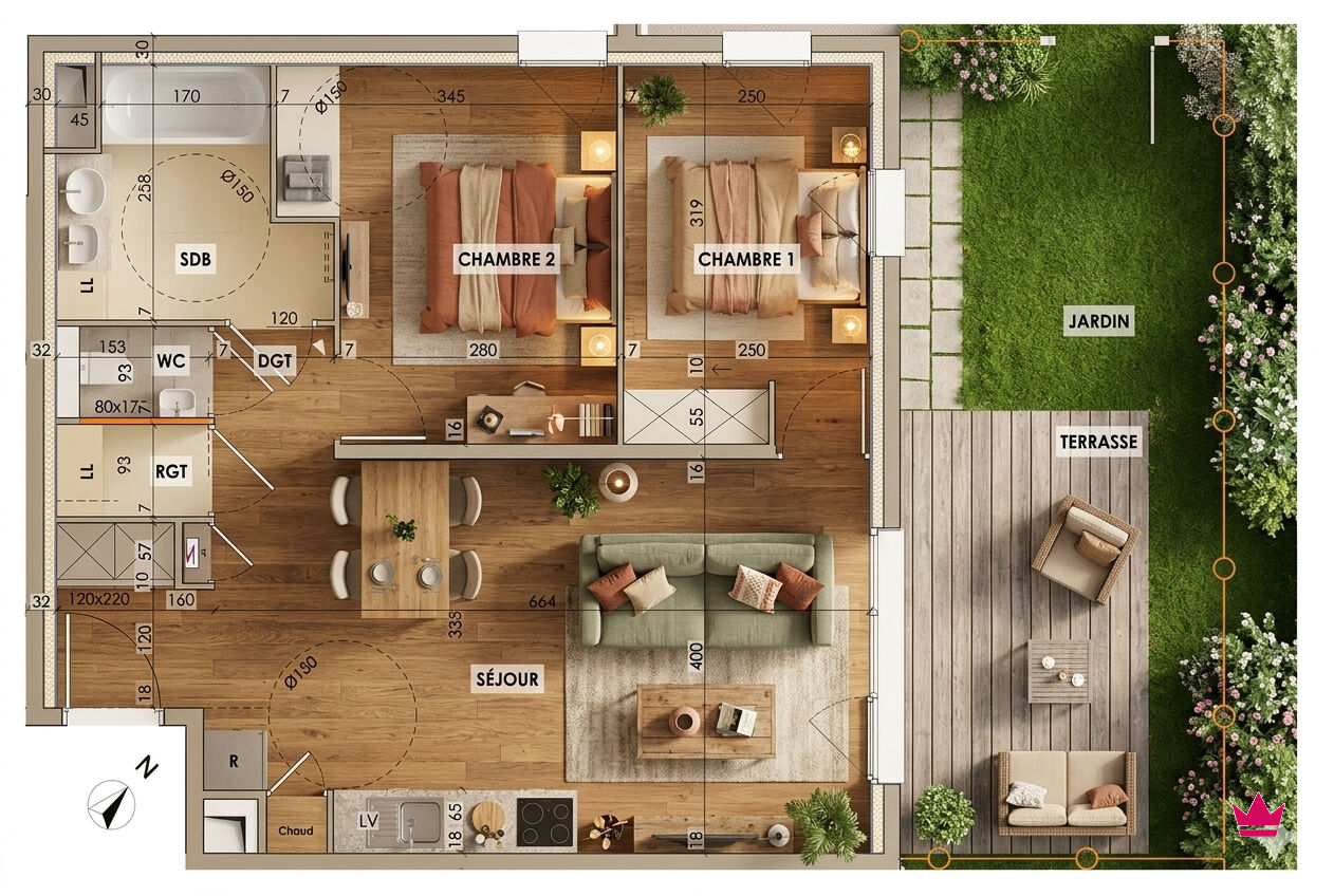 1 séjour lumineux de 28,98 m² ouvert sur la terrasse et le jardin
