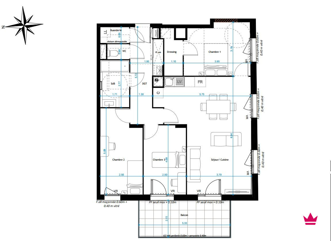 Découvrez ce bel appartement T4 de 84.27m². Il offre une belle entrée avec placard, un séjour de 30.90m² ainsi que 3 chambres de 10.12m², 11.81m², 11.64m². Vous y trouverez également une salle de bain, une buanderie ainsi que des WC inépendants.