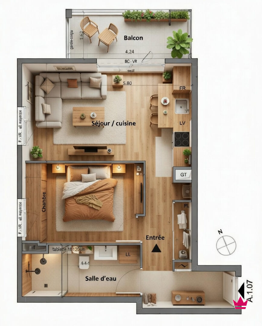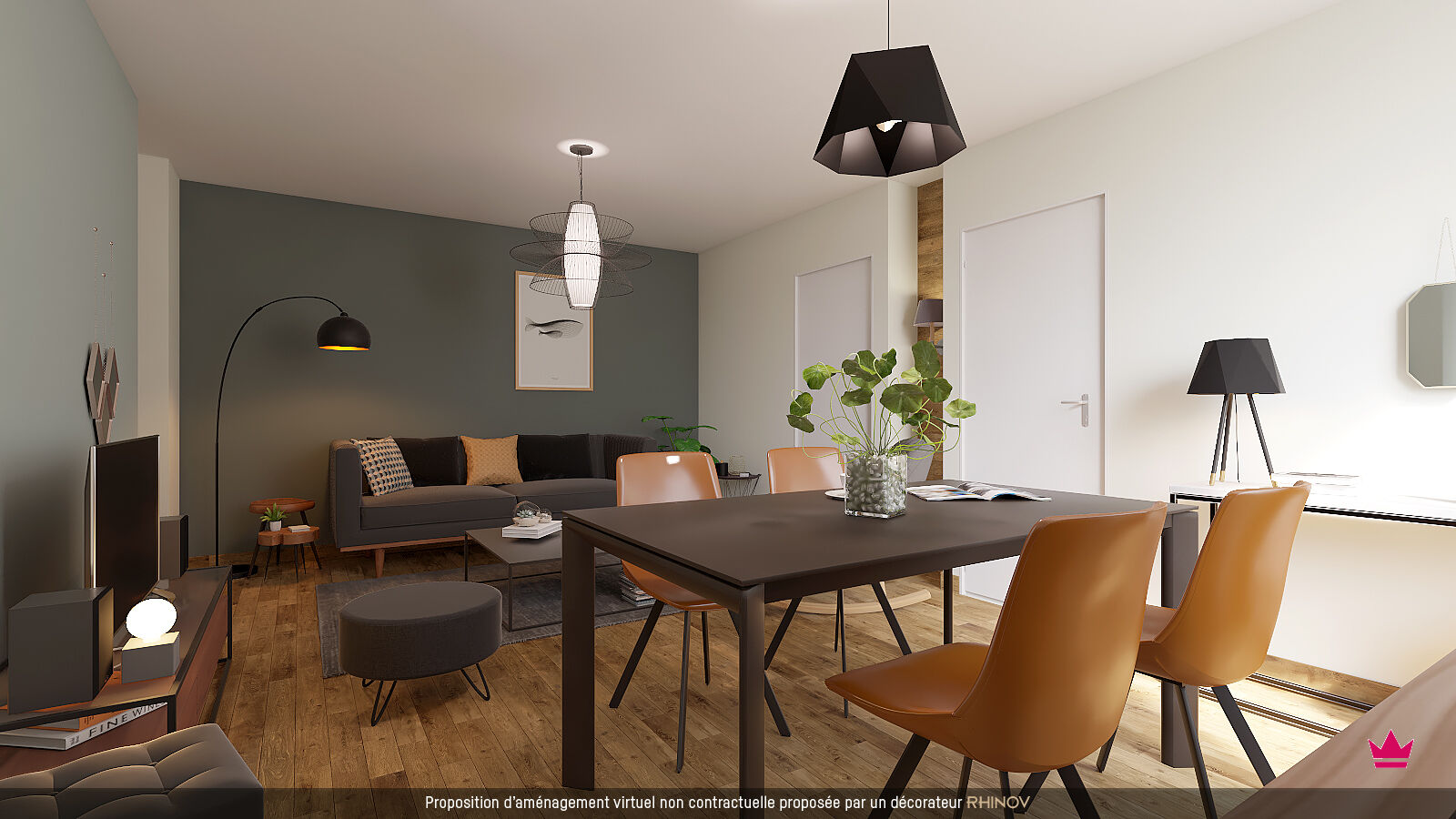 Carrelage 60x60 au choix dans le séjour et la cuisine, revêtement stratifié dans la chambre.