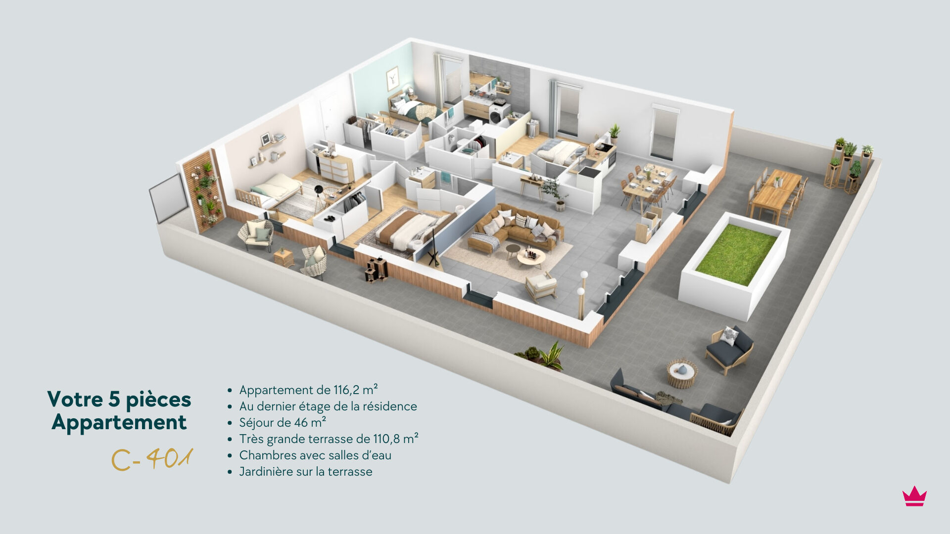 Au 4e et dernier étage de cette résidence de 2025, en frais de notaire réduits, ce superbe T5 de 116m², 4 chambres, 3 pièces d'eau, est doté d'une fabuleuse terrasse de 110m² offrant une vue à couper le souffle.
