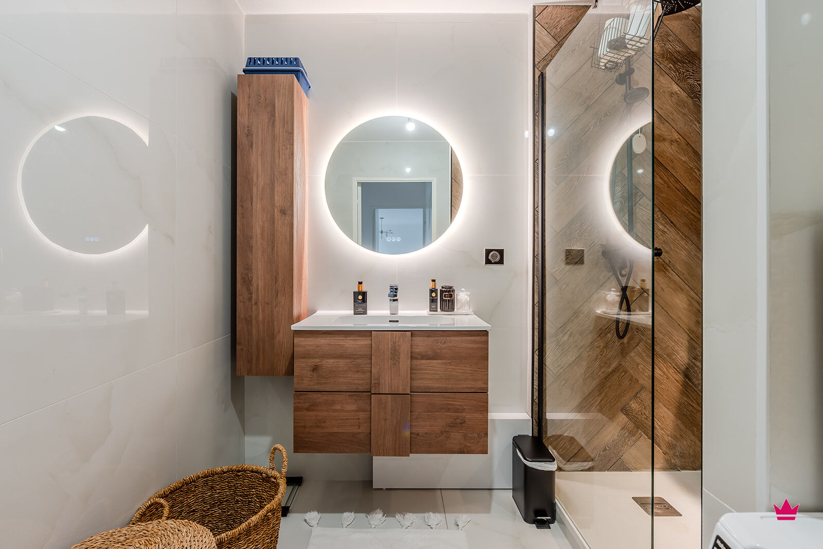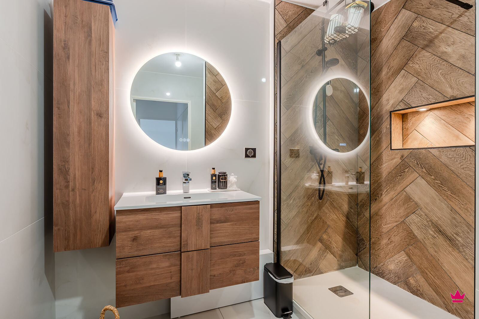 L'espace nuit séparé comprend deux chambres. La salle d'eau et la plomberie a entièrement été refaite et repensée avec de beaux meubles et un espace pour la machine à laver. La douche spacieuse avec sa niche éclairée et son carrelage toute hauteur rajoute au charme de cette magnifique salle d'eau.