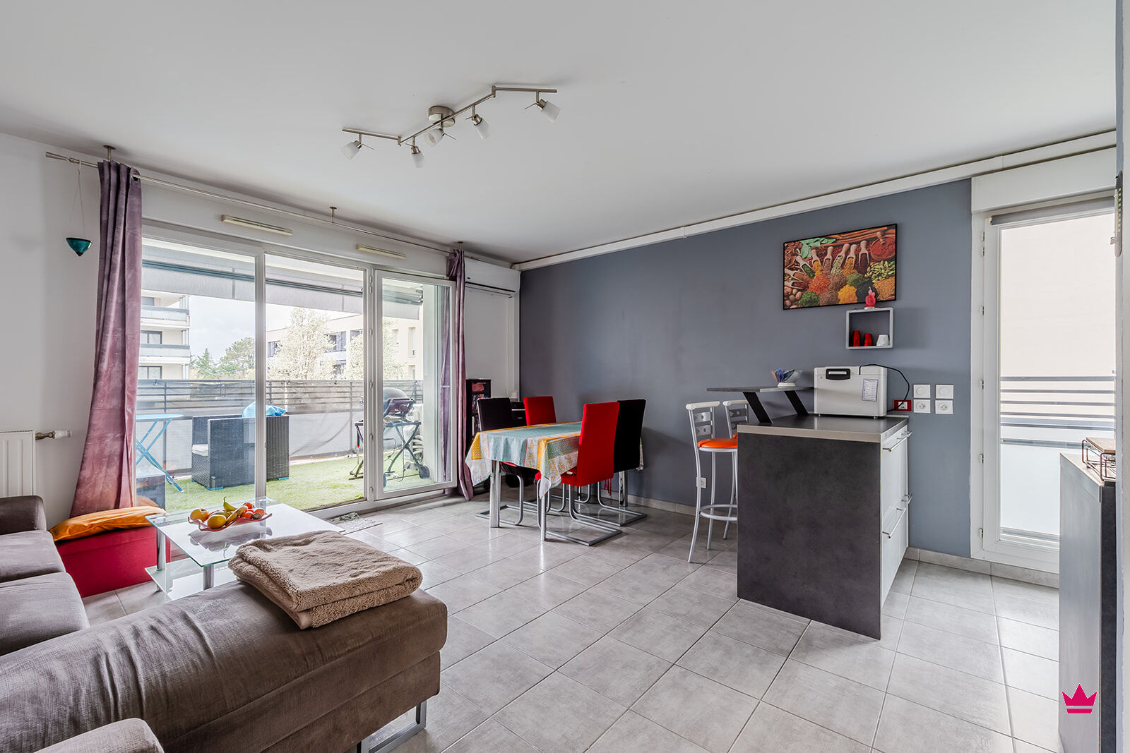 L'appartement dispose d'une spacieuse pièce de vie comprenant cuisine ouverte sur séjour avec accès au grand balcon, de deux chambres