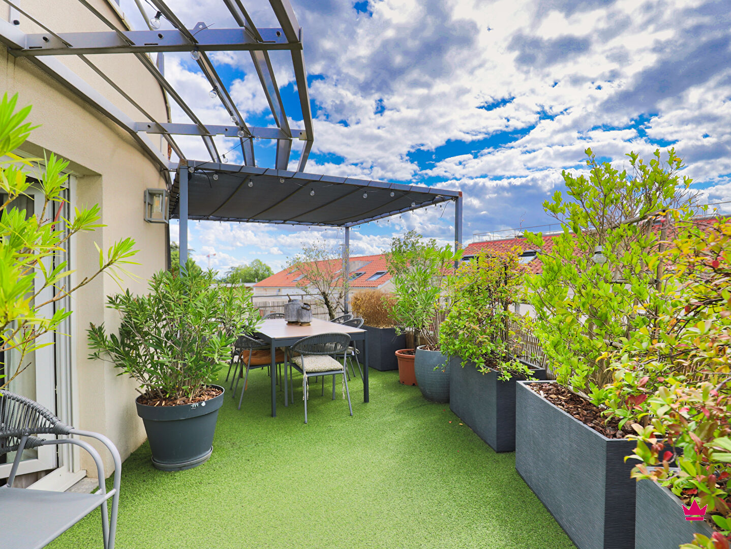 En plein coeur du centre-ville de Meyzieu, découvrez ce superbe toit-terrasse de 103 m² carrez (111 m² au sol) situé au 4? et dernier étage d'un immeuble récent. Il bénéficie d'une belle terrasse de 55 m² exposée sud-ouest, sans vis-à-vis, offrant une vue dégagée.