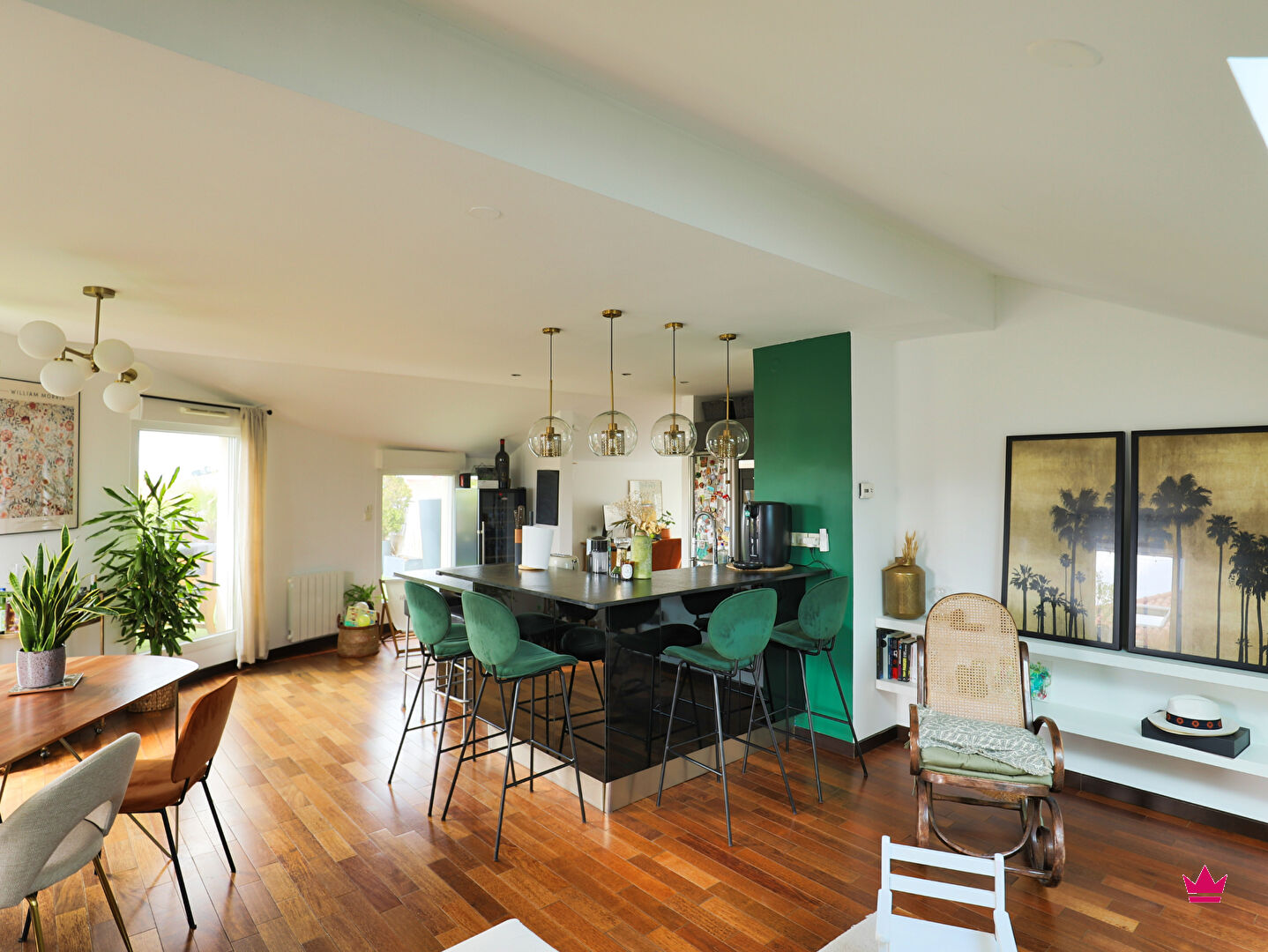 La pièce de vie se compose d'une cuisine américaine ouverte sur la salle à manger et le salon. Vous serez immédiatement séduit par la luminosité traversante apportée par les grandes baies vitrées donnant sur la terrasse.