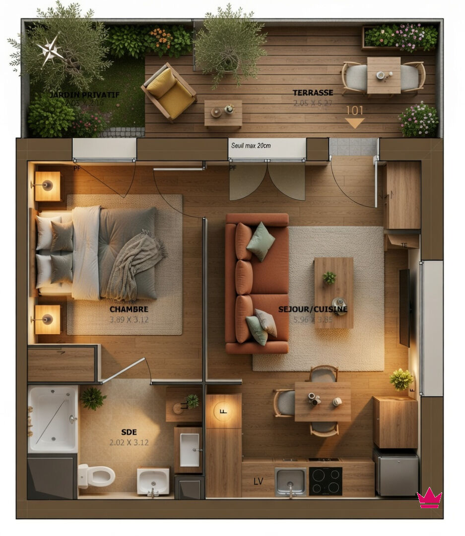 Séjour/cuisine ouverte de 22,6 m² : Espace convivial et lumineux, prolongé par une terrasse ensoleillée et un jardin privatif.