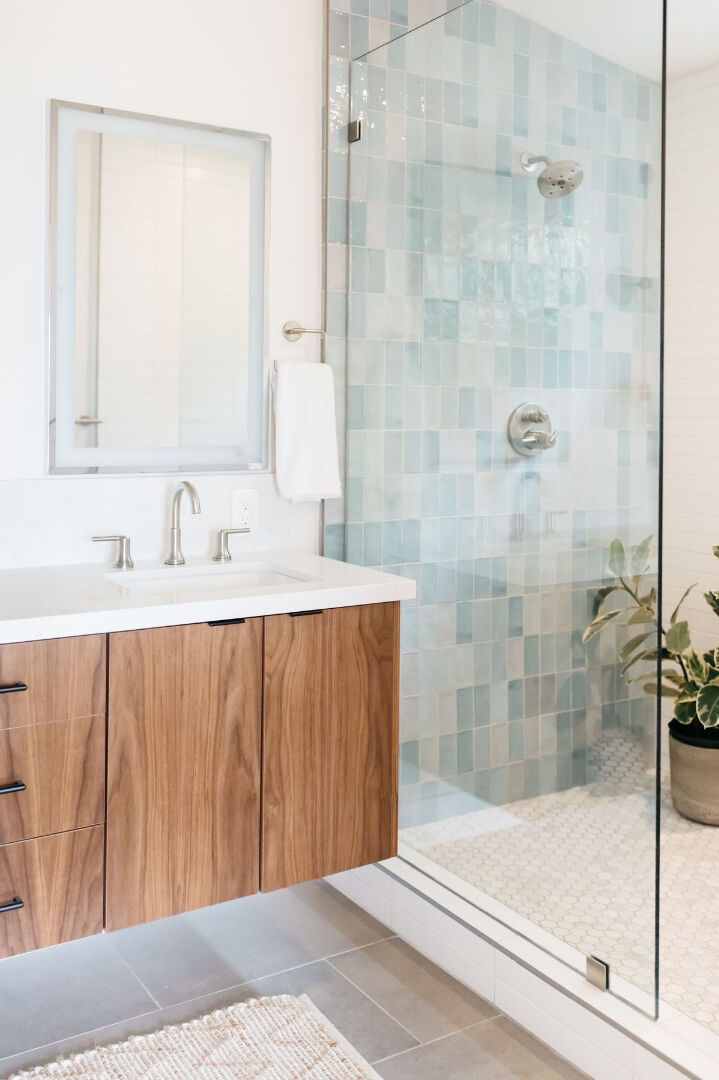 Salle de douche moderne de 5,4 m² : Équipée d'un meuble vasque avec miroir et bandeau lumineux, et d'une robinetterie mitigeuse.