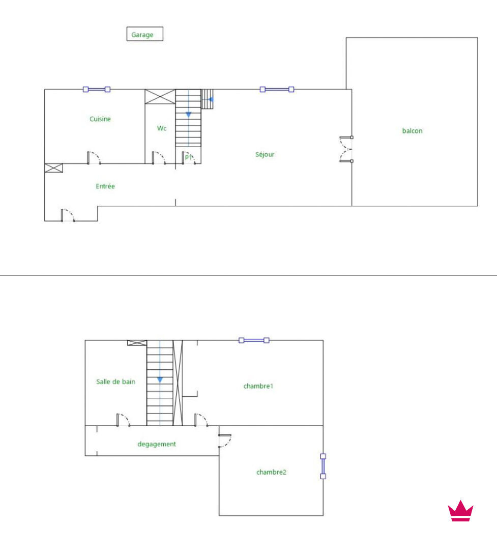 Au 2ème niveau, 2 belles chambres de 9 et 11m2 environ, une avec placard intégré et une salle de bains avec un deuxième WC, un placard de rangement.