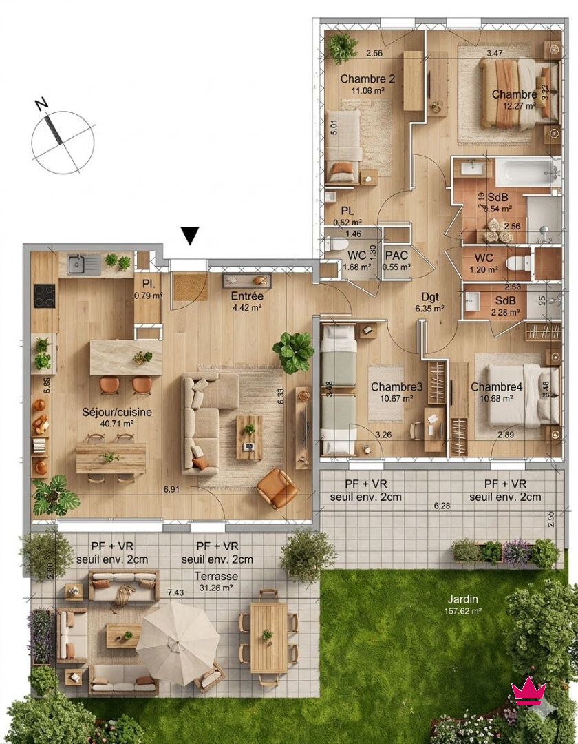 Jardin privatif de 157,62 m² : Un espace vert pour profiter du soleil, organiser des barbecues ou cultiver vos plantes.