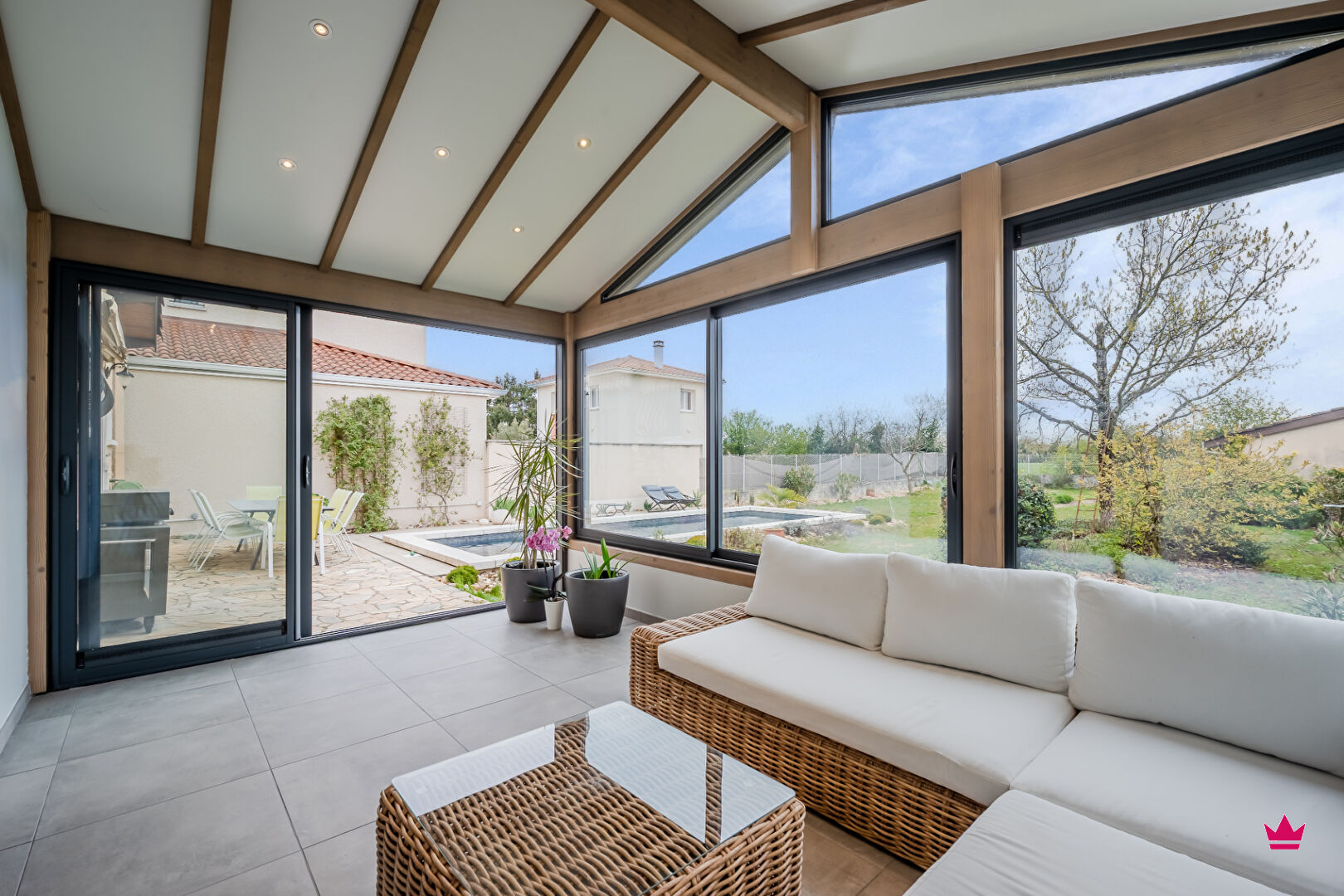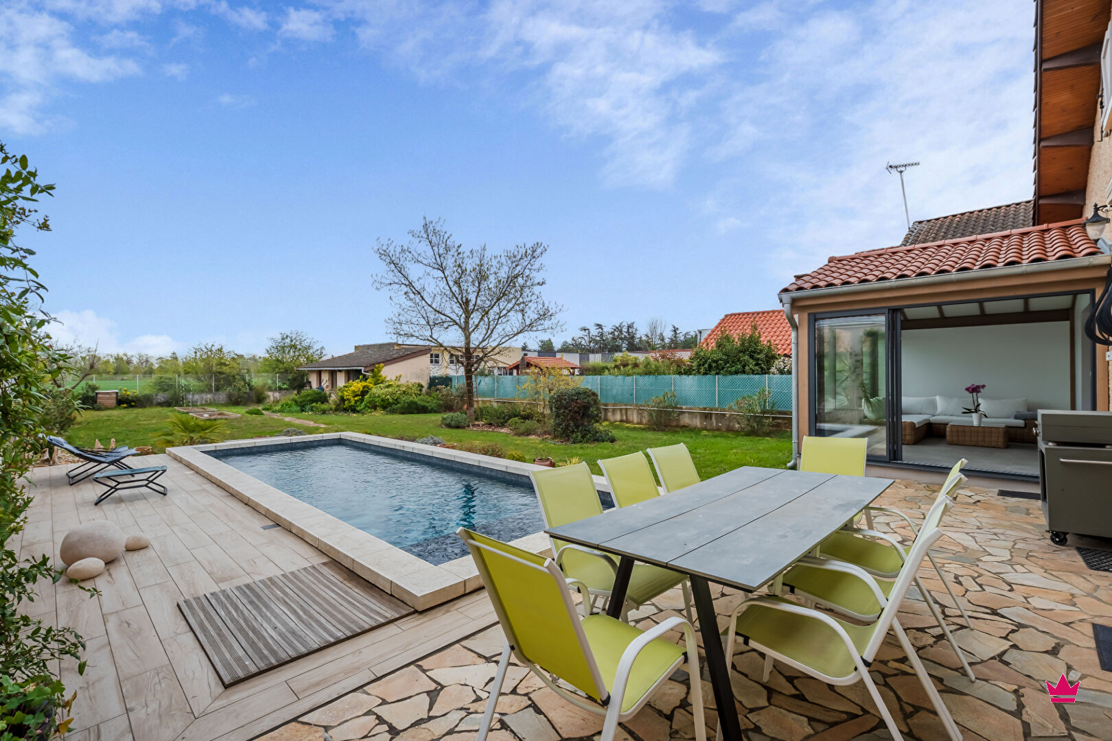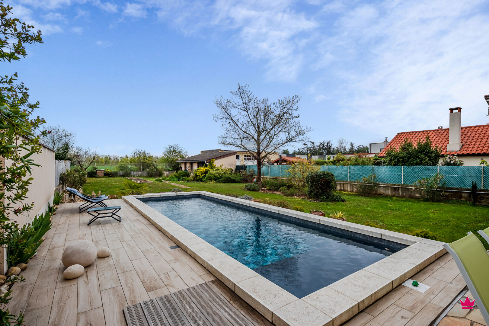Le jardin, très agréable et accessible depuis le salon ou la cuisine, vous permettra de profiter des beaux jours à l'abris des regards, en terrasse ou autour d'une très belle piscine avec nage à contre-courant (9x3).