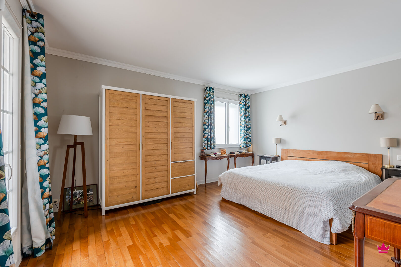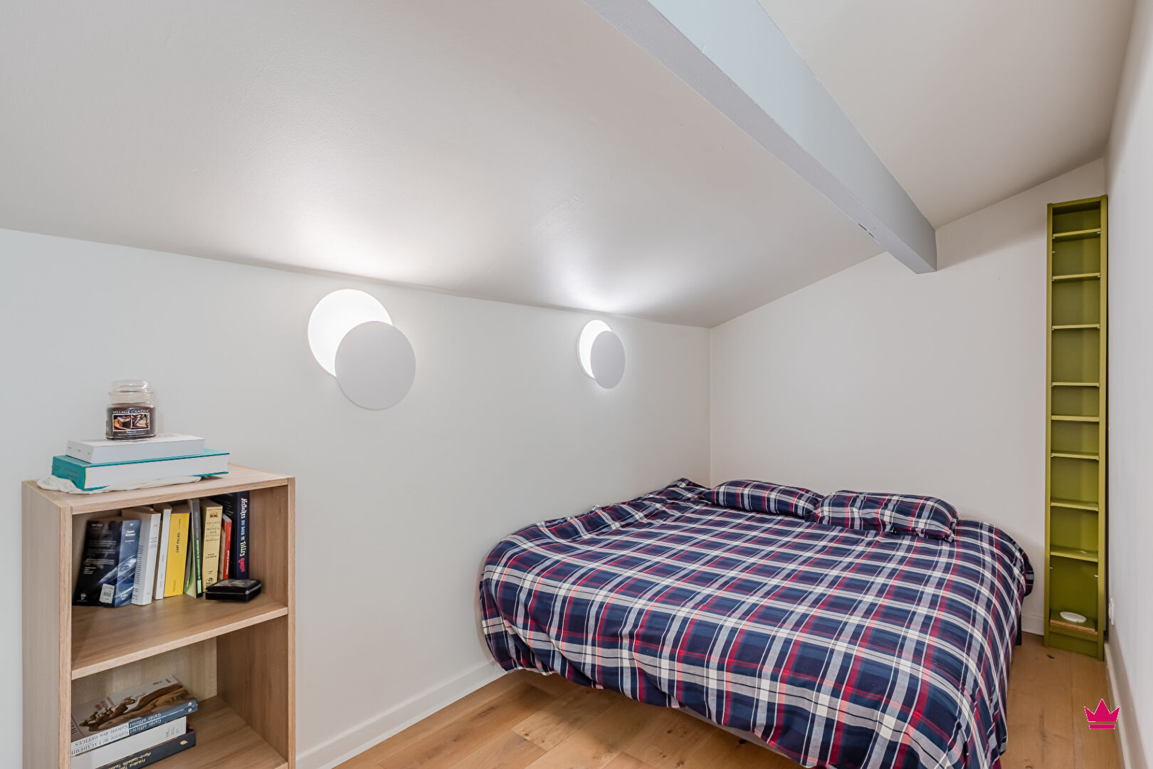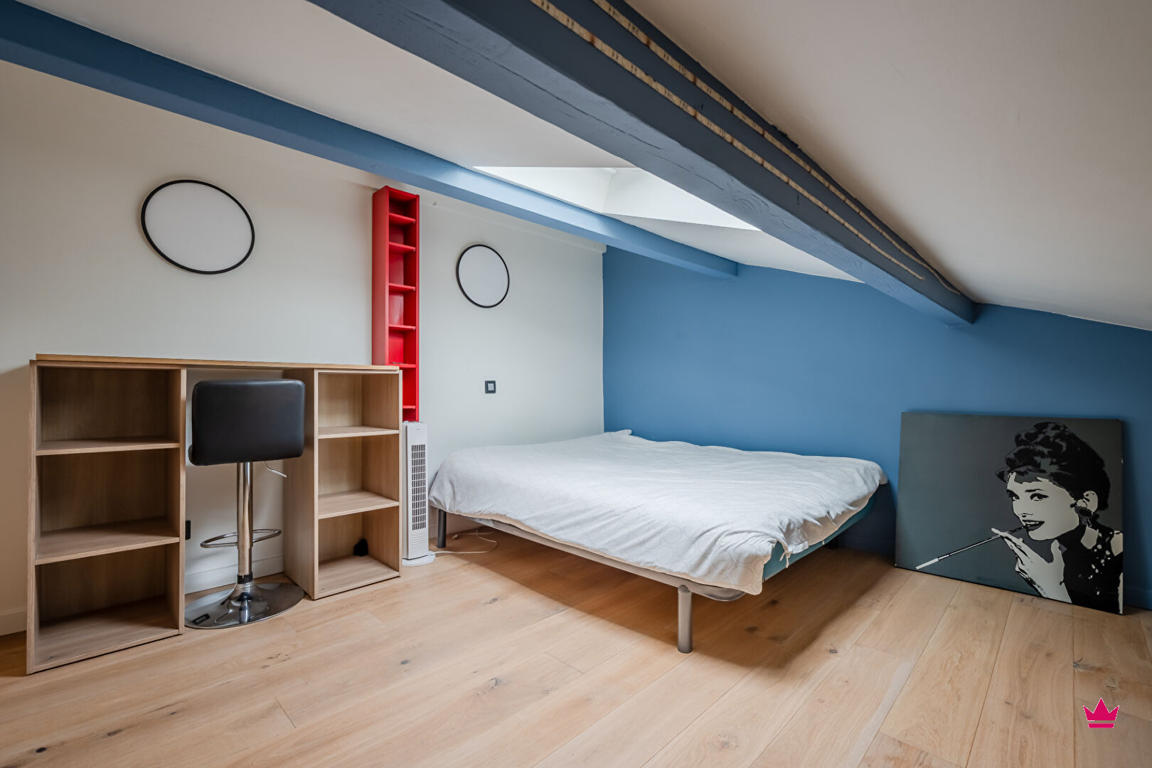 A l'étage, un grand dégagement pouvant accueillir un bureau ou un lit permet l'accès à une seconde chambre mansardée de plus de 14 m², un dressing et une salle d'eau avec WC.