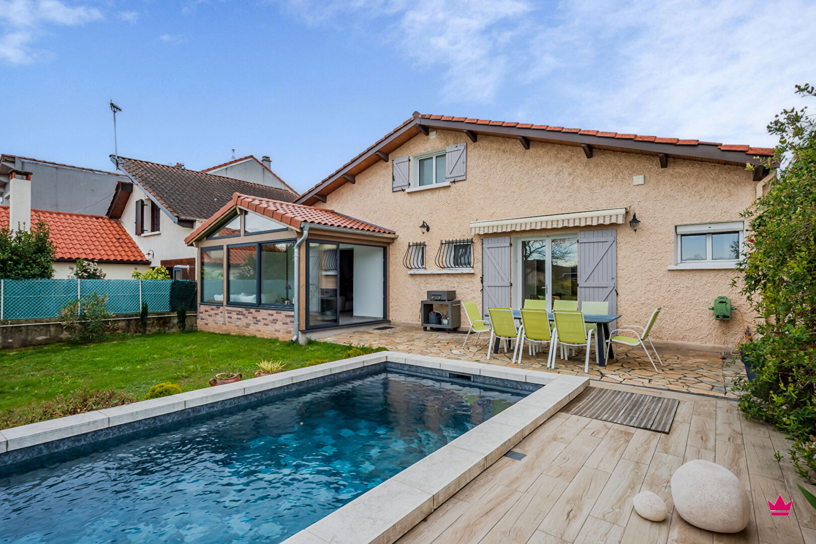 NOUVEAUTE ! LIONROSE vous propose en EXCLUSIVITE cette maison de 121 m², entièrement rénovée depuis 2021 et construite sur un beau terrain clos et paysagé de 620 m² avec piscine sécurisée.