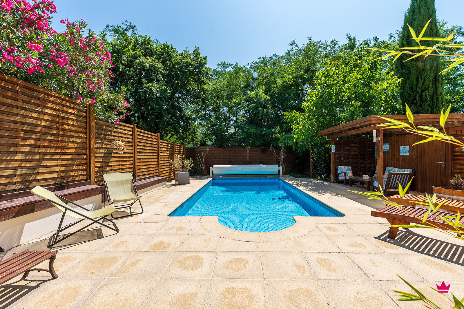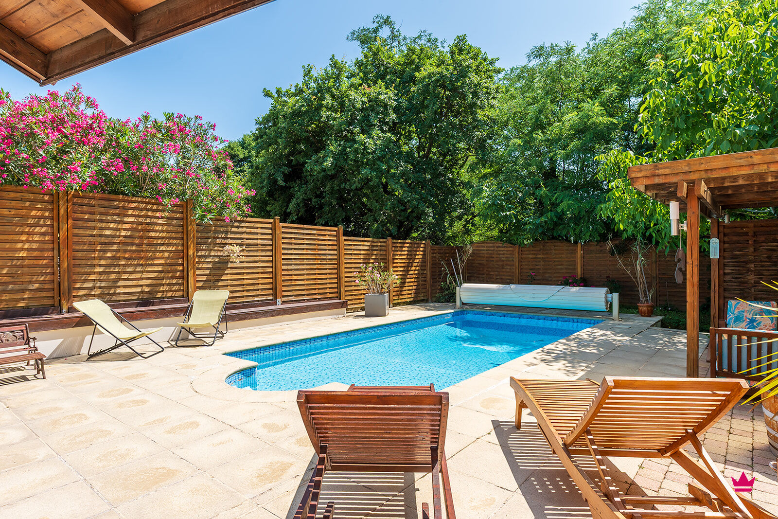 Une jolie véranda de plus de 20m2 vous accueille devant la façade principale de la maison, une belle terrasse abritée avec coin barbecue vous permet de profiter des extérieurs, la piscine (3X7) dispose d'un abri pour mobilier extérieur, Carport pour 2 voitures et vélos.