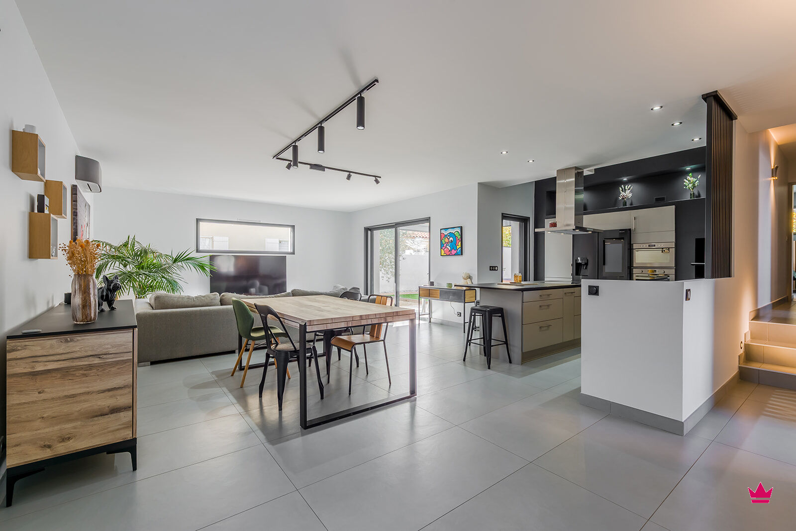 La pièce de vie s'ouvre largement sur le jardin et la piscine, avec une cuisine entièrement équipée qui prolonge naturellement l'espace. L'ensemble forme un lieu convivial, moderne et baigné de luminosité.