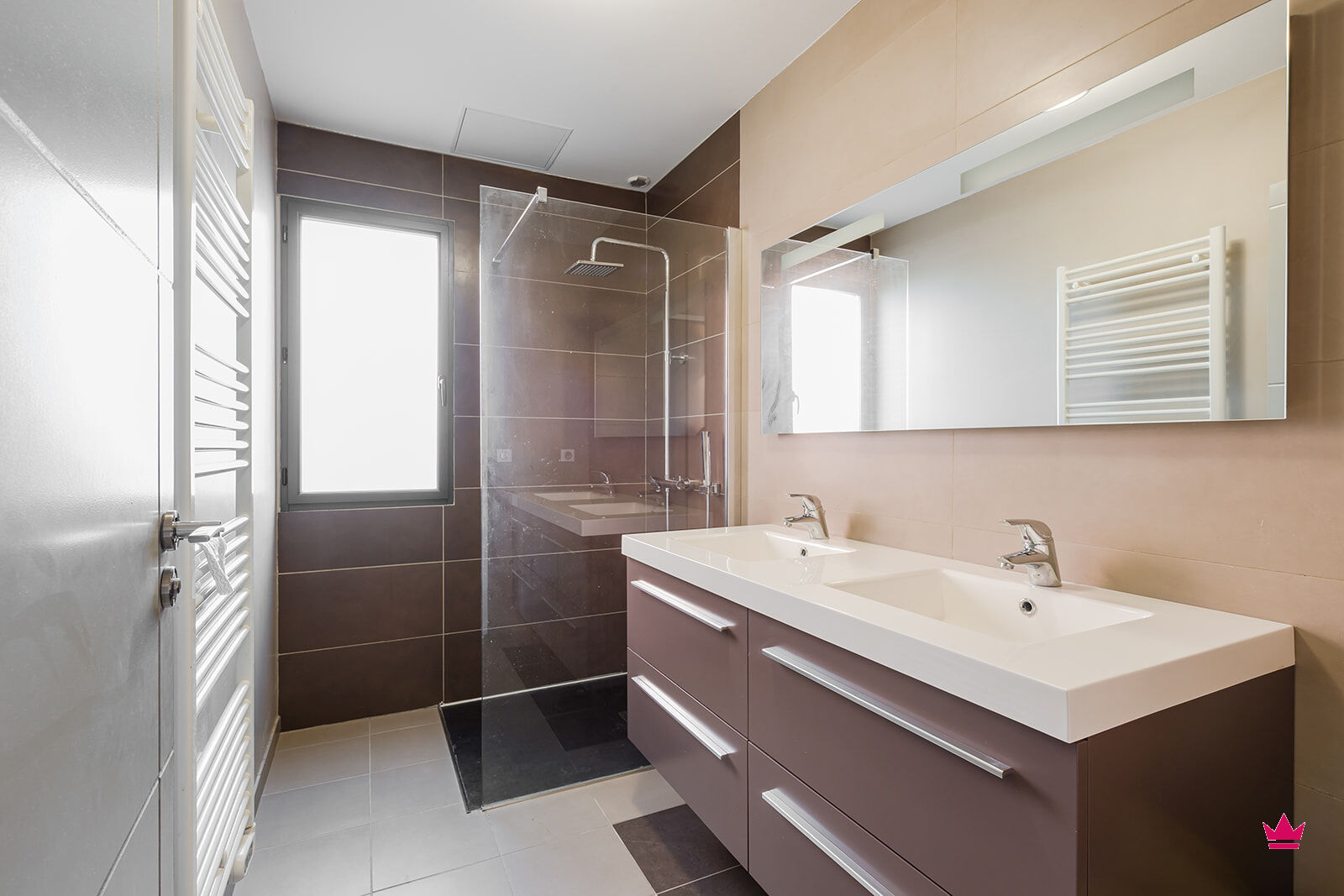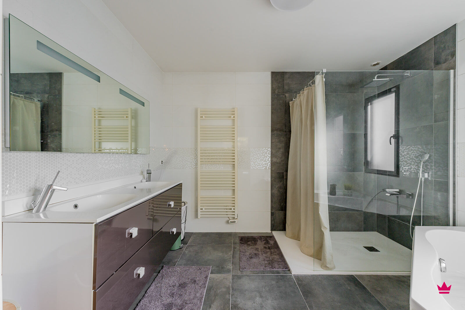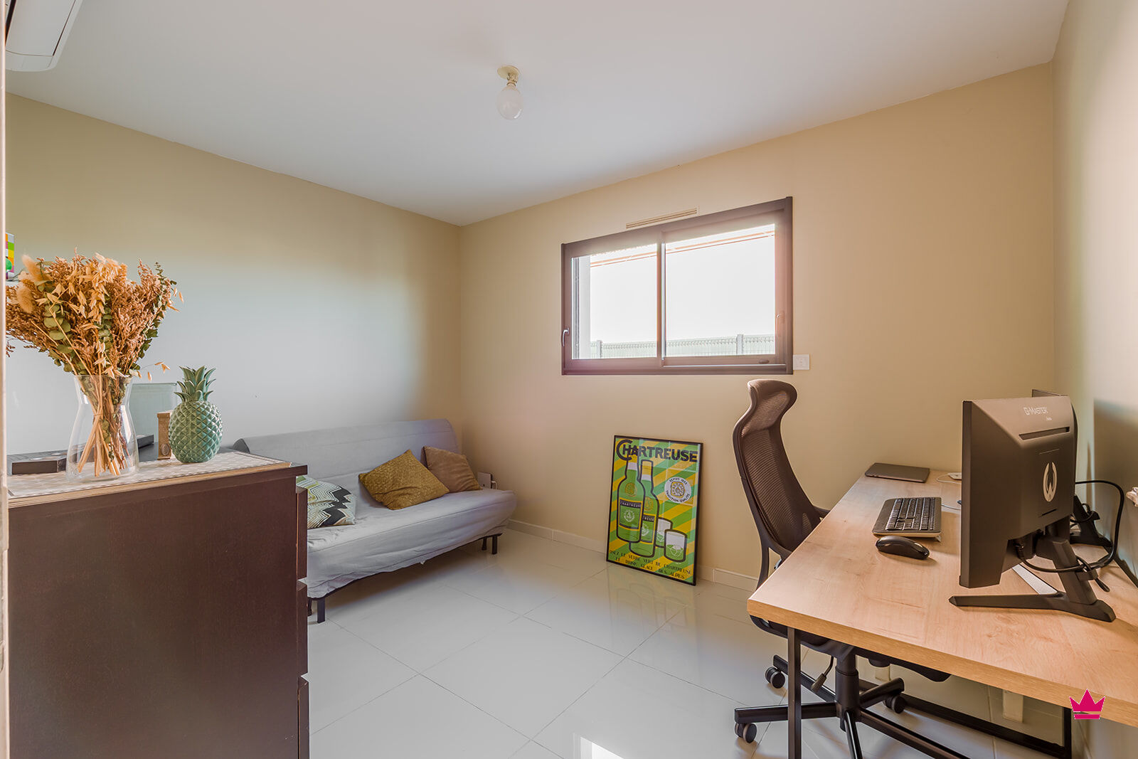 Le garage de 22,8 m² permet de stationner et de stocker facilement, tandis que les prestations renforcent encore l'attractivité du bien : climatisation (3 unités), chauffage au gaz de ville, menuiseries aluminium double vitrage, toiture plate et excellent niveau d'entretien général.