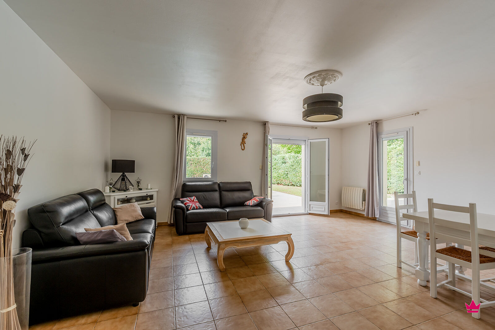 L'espace de vie est lumineux et bien agencé, s'articule autour d'un poêle à granulés qui apporte confort et économie au quotidien. La pièce s'ouvre sur la terrasse et le jardin, offrant un cadre agréable pour profiter de la piscine et des moments en extérieur sans aucun vis-à-vis.
