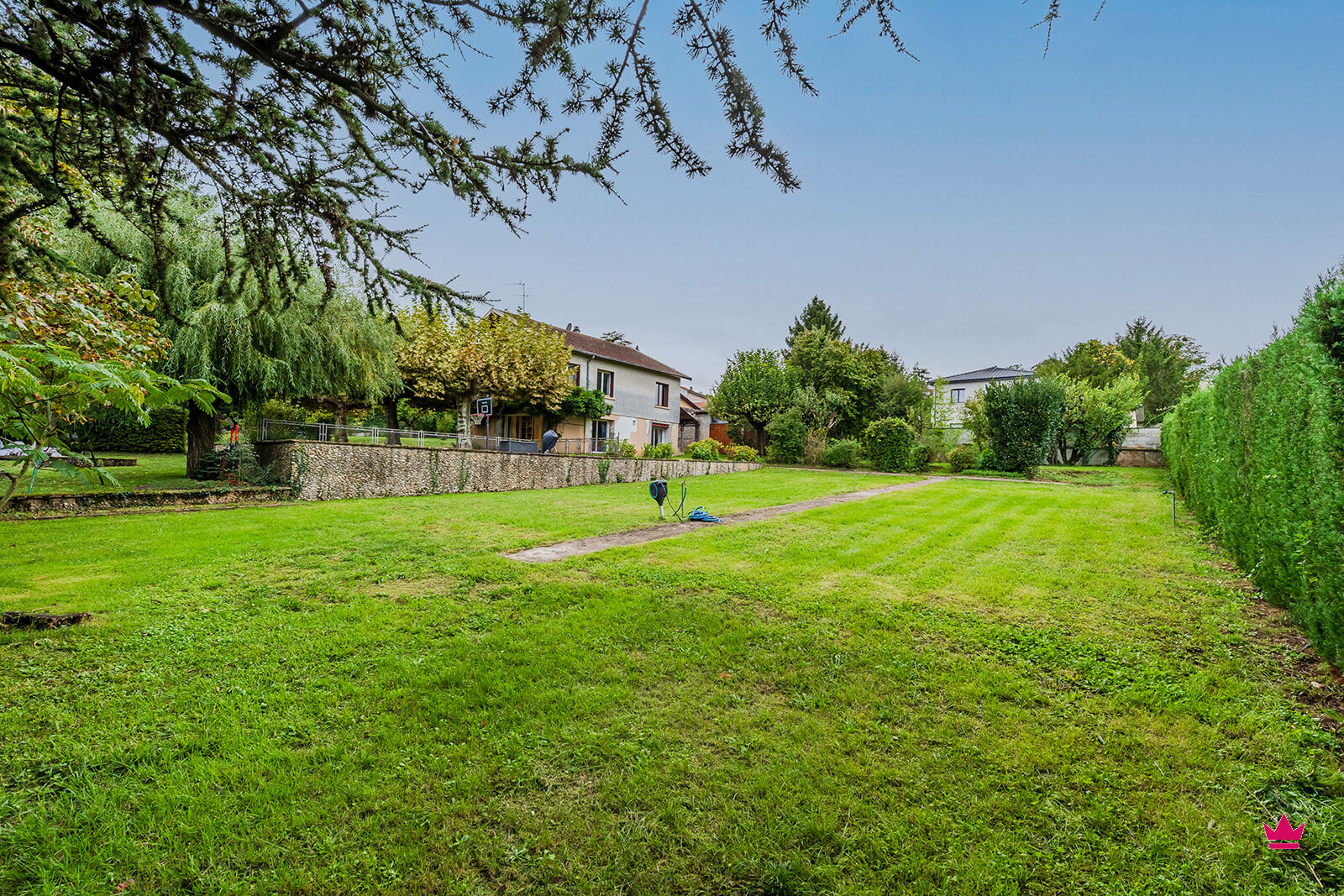 Édifiée sur une parcelle verdoyante et divisible de 2 440 m², cette propriété offre un cadre paisible et verdoyant ainsi qu'un beau potentiel, aussi bien pour une résidence familiale que pour un projet d'investissement.