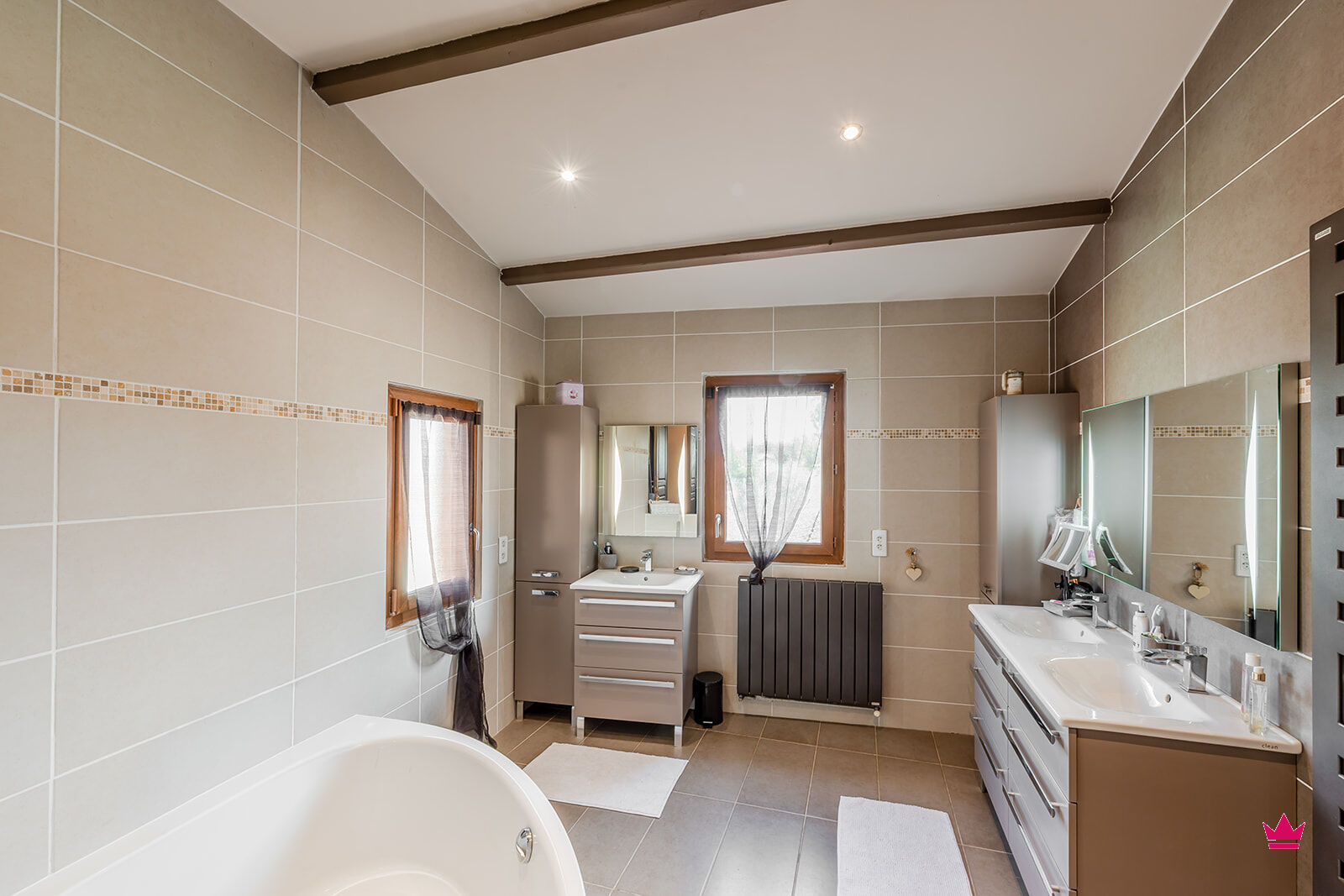A l'étage, vous retrouvez 3 chambres deux dressings ainsi qu'une très grande salle de bain avec baignoire et douche, très spacieuse et lumineuse.