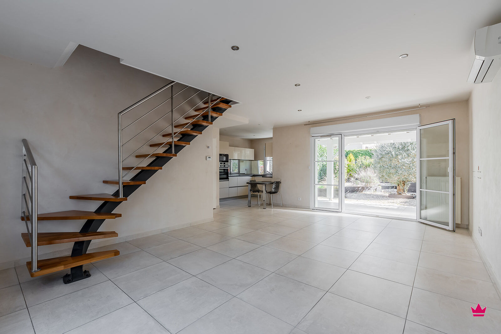 Au rez-de-chaussée, elle se compose d'une cuisine équipée ouverte sur le séjour offrant un espace de vie chaleureux, convivial et ouvert sur un jardin sans vis à vis.