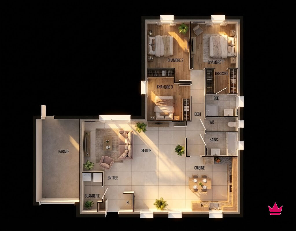 Une belle pièce de vie de 37m² avec séjour et cuisine ouverte, largement ouverte sur l'extérieur. La parcelle développe 277m² , offrant un véritable prolongement naturel de l'espace intérieur.