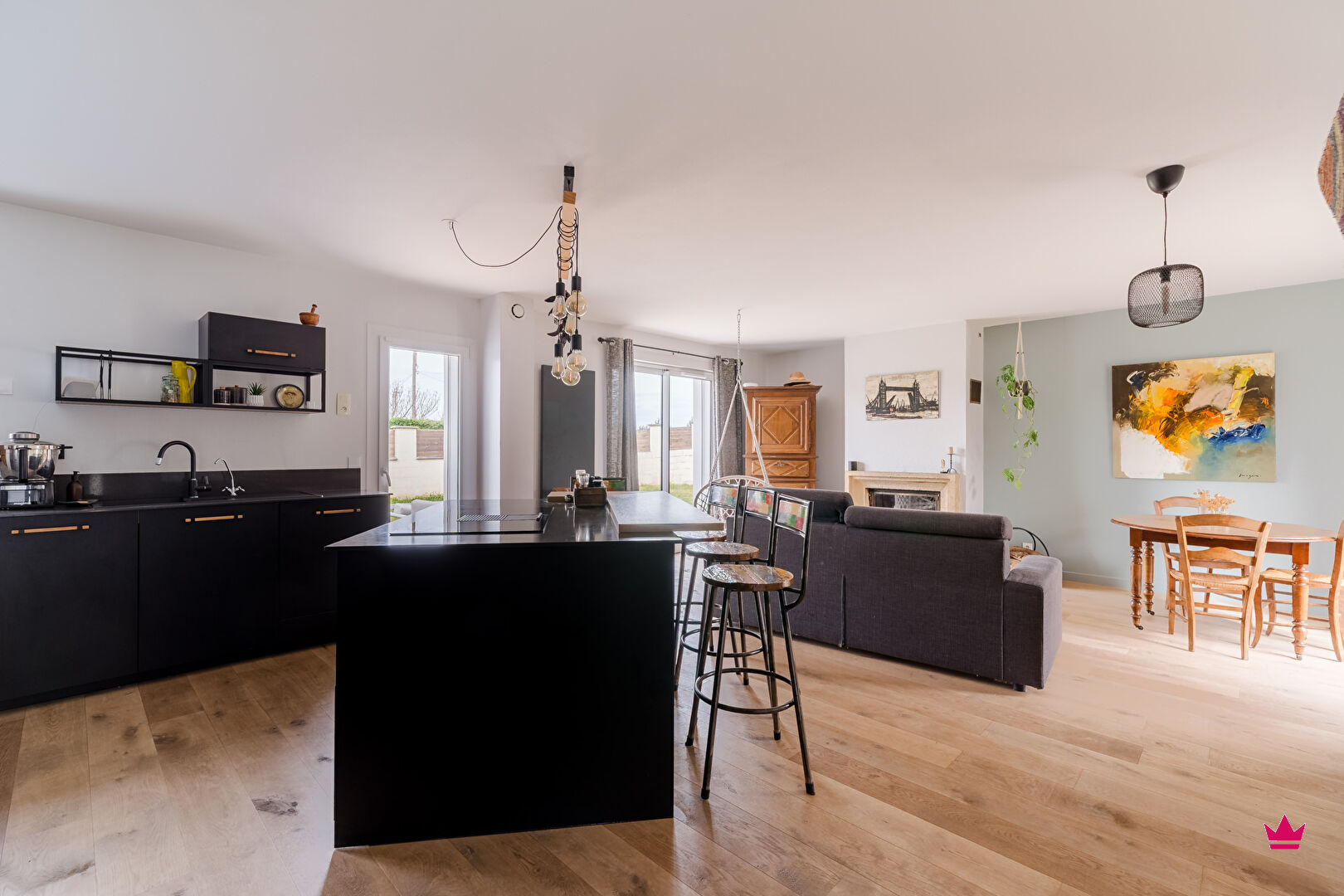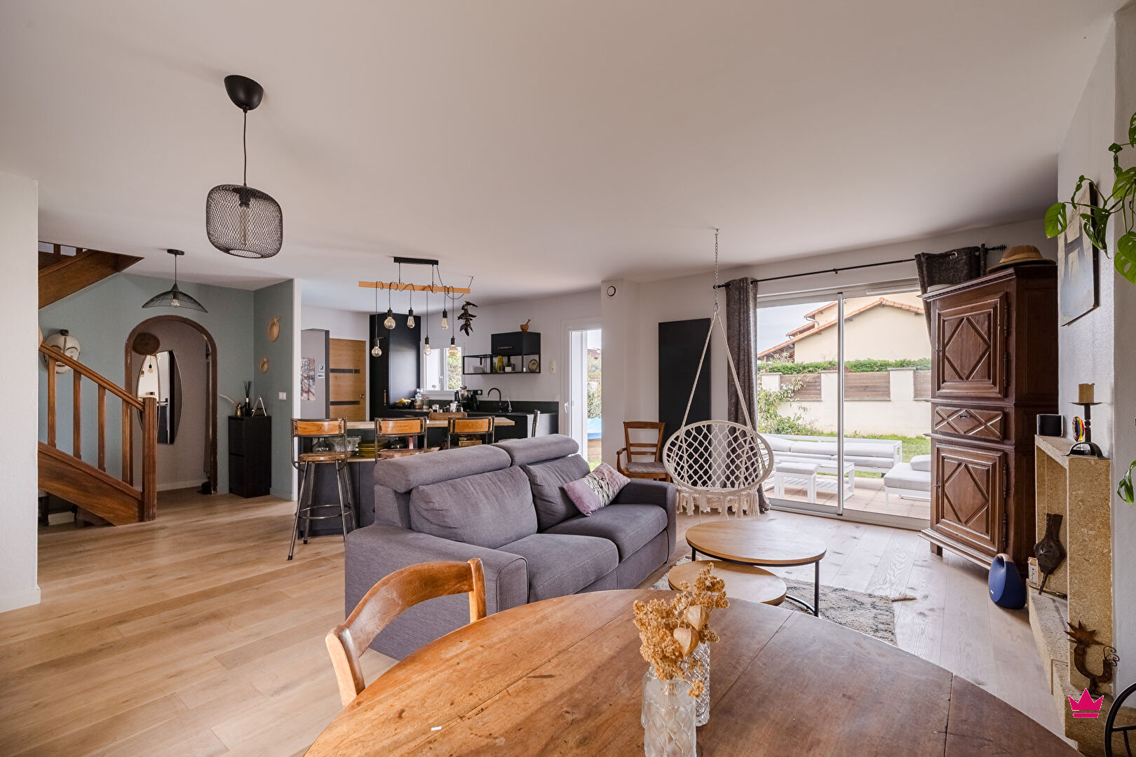 Au rez-de-chaussée, vous profiterez d'une belle pièce de vie lumineuse et chaleureuse, composée d'un vaste séjour avec cheminée ouvert sur une cuisine équipée, offrant un espace convivial et fonctionnel. Un garage, une buanderie ainsi qu'un WC indépendant complètent ce niveau.