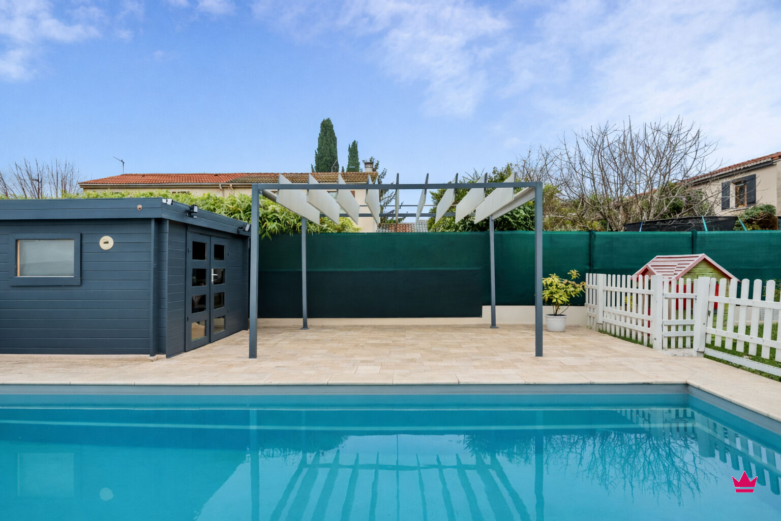 A l'extérieur, vous profiterez d'un jardin joliment aménagé avec une piscine creusée, chauffée et sécurisée, idéale pour les beaux jours.