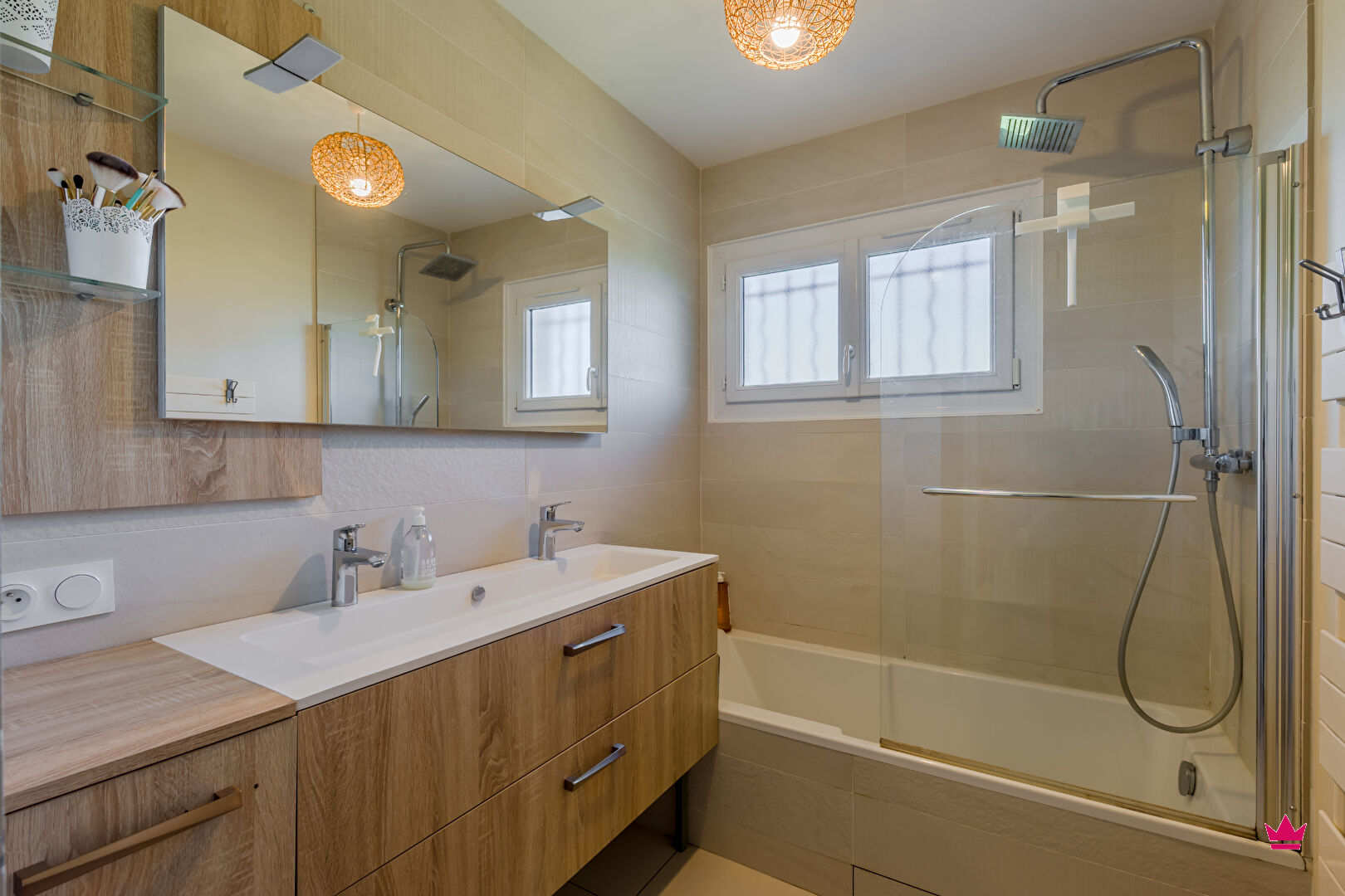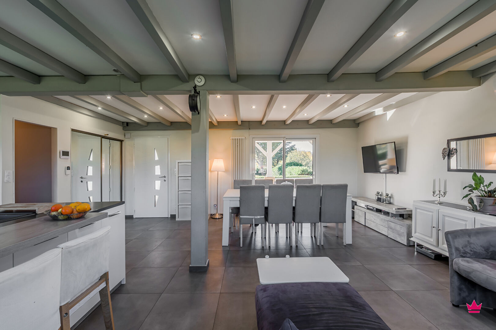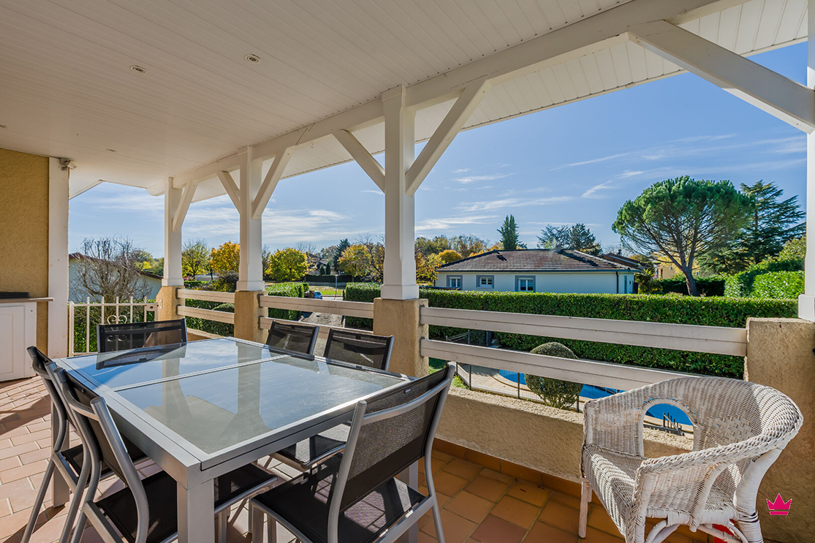 Vaste séjour de 46 m² traversant (Sud-Nord) donnant sur terrasse et vue sur la piscine, cuisine ouverte, 3 chambres à l'étage, 1 chambre et une salle de sport au rez-de-chaussée, une salle de bains familiale, une salle d'e douche parentale, espace buanderie, grand garage et cave. Bon DPE, climatisation réversible, poêle à granules, fenêtres récentes avec moustiquaires.