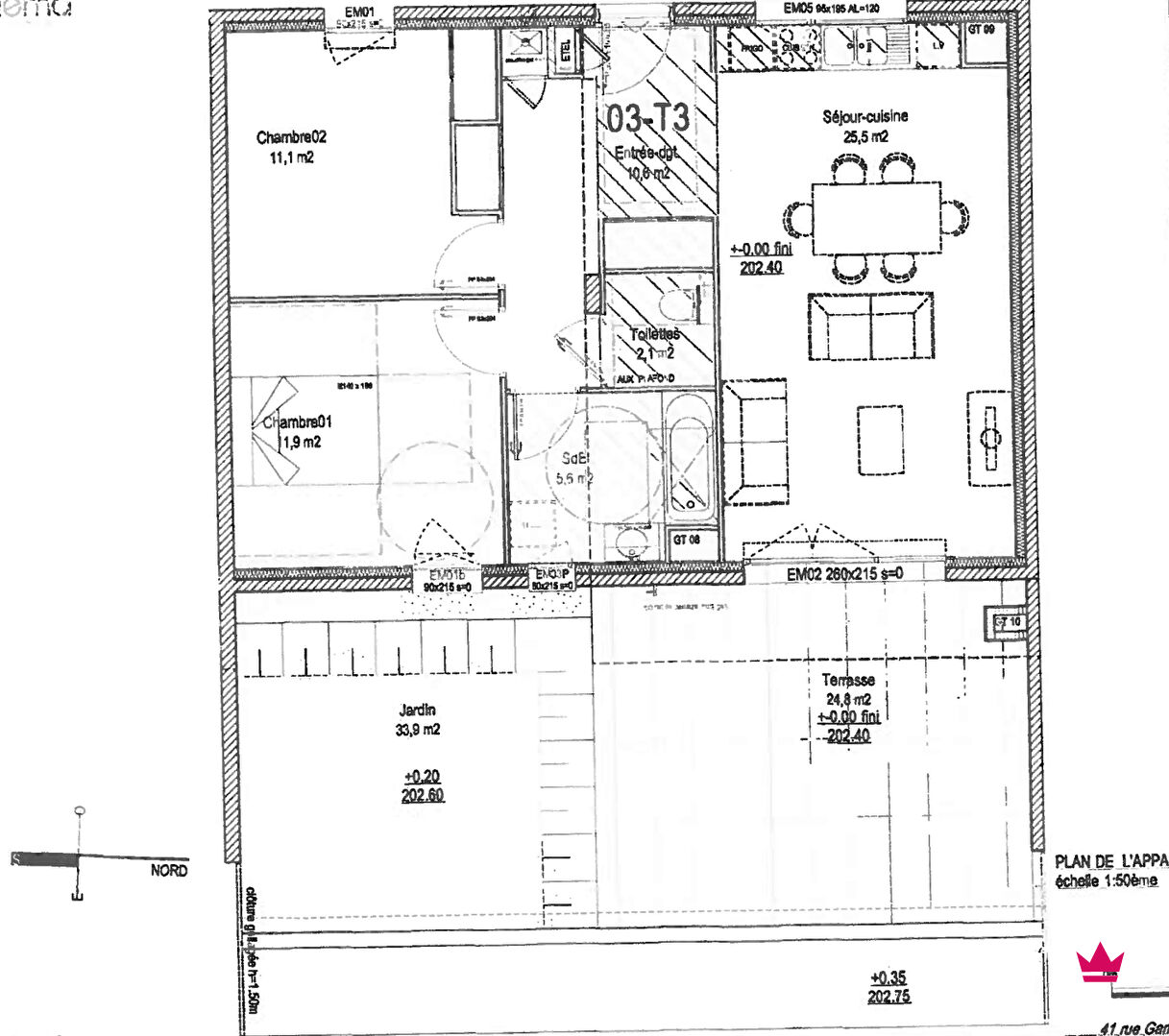 L'appartement est agencé comme suit : une entrée avec rangements, ouvrant sur une pièce de vie avec cuisine donnant accès à une terrasse de 25m2 et au jardin. Côté nuit, le logement dispose de deux chambres, une salle de bains et des WC séparés.